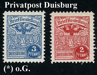 6799 | 18 € | 4100 Duisburg allgem. Belege, Tagesstempel, Ganzsachen etc. : Duisburg 1894 Privatpostmarken 2 Pf. kamin u. 3 Pf. blau "Brief-Bestellung" mit Stadtwappen (= Zweigniederlassung der Düsseldprfer Brief-Bestellung) je ungebr. (o.G.) 2 Belege (Mi.1/2) | ![]() | |