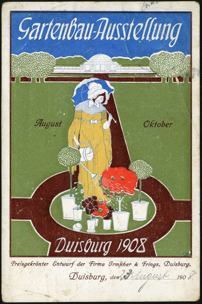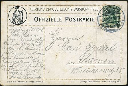 6815 | 40 € | 4100 Sonderstempel : DUISBURG/ Gartenbau-/ Ausstellung 1908 (24.8.) seltener SSt auf seltener Color-Künstler-Ak.: Gartenbau-Ausst. 1908 (Gärtnerin, sign. "L V") Bedarfsspuren, klar gest.! (Bo.1) | ![]() ![]() | |