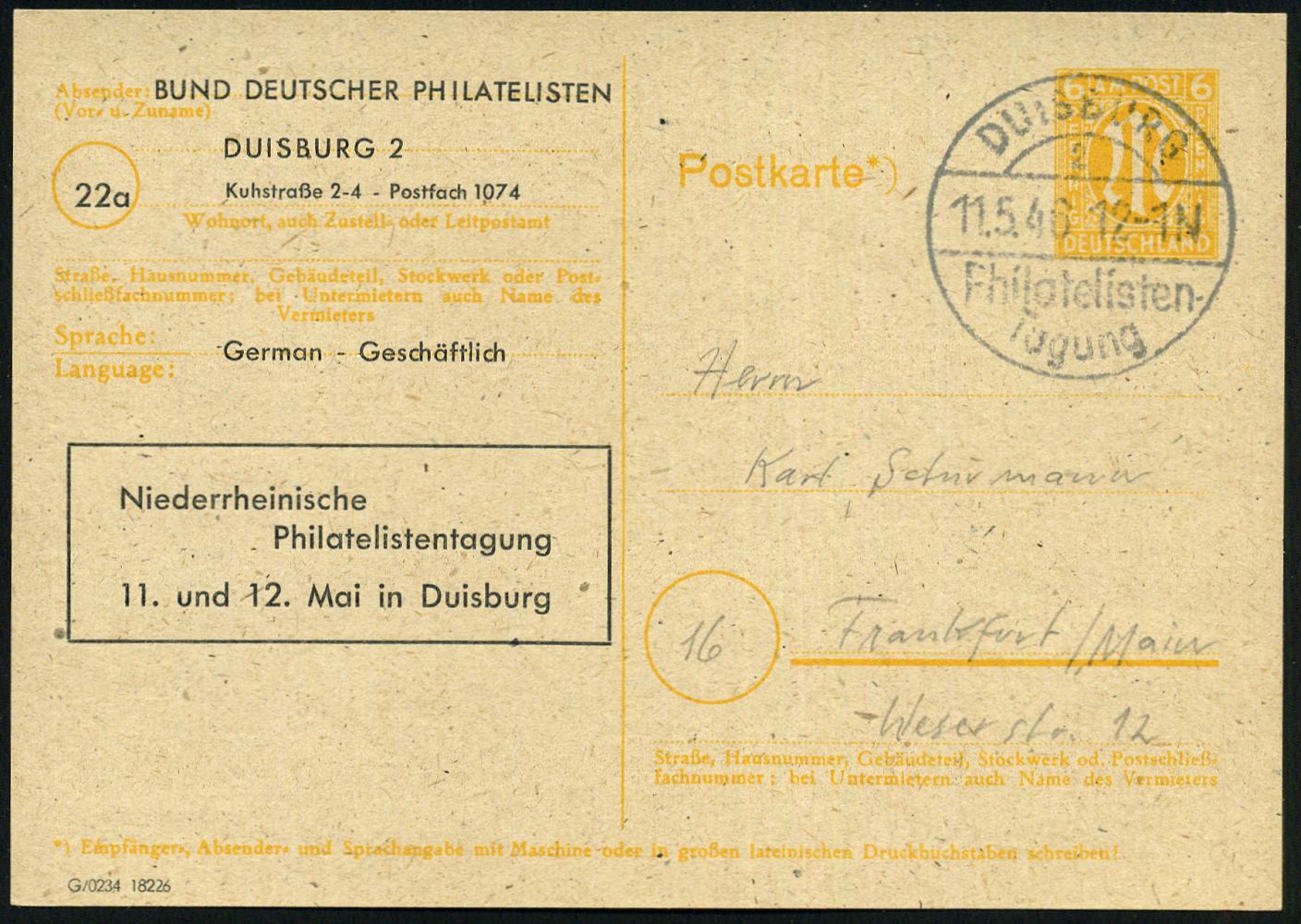 6817 | 18 € | 4100 Sonderstempel : DUISBURG/ 2/ Philatelisten-/ Tagnung 1946 (11.5.) SSt auf amtl. P 6 Pf. AM-Post gelb + Zudruck: BUND DEUTSCHER PHILATELISTEN.. Niederrhein. Philatelistentagung 11. u. 12. Mai (Mi.PZD 905), Fern-Kt. (Bo.9) | ![]() | |