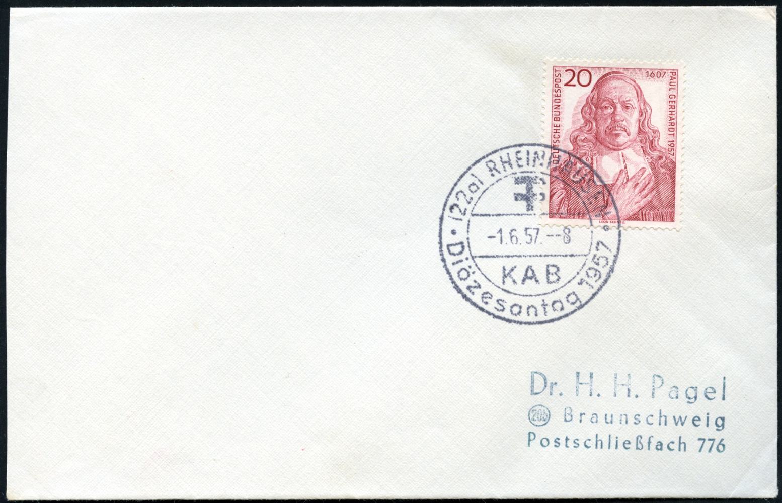 6819 | 18 € | 4100 Sonderstempel : (22a) RHEINHAUSEN/ KAB/ Diözesantag 1957 (1.6.) seltener SSt = Doppelkreuz-Logo (u. MonogrAMM: Kathol. Arbeiter-Bewegung) EF 20 Pf. Paul Gerhardt (Mi.253 EF) Inl.-Bf., (Bo.1) | ![]() | |