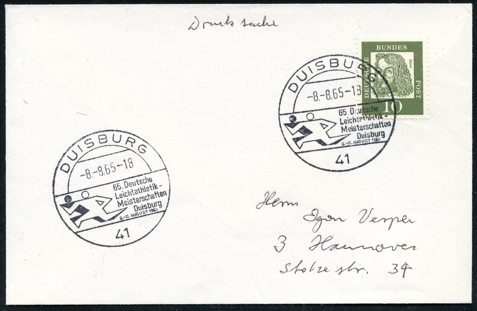 6821 | 15 € | 4100 Sonderstempel : 41 DUISBURG/ 65.Deutsche/ Leichtathletik-/ Meisterschaften 1965 (8.8.) SSt (Läufer) klar auf kleinem Inl.-Bf. (Bo.40, Finaltag) | ![]() | |