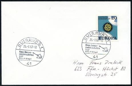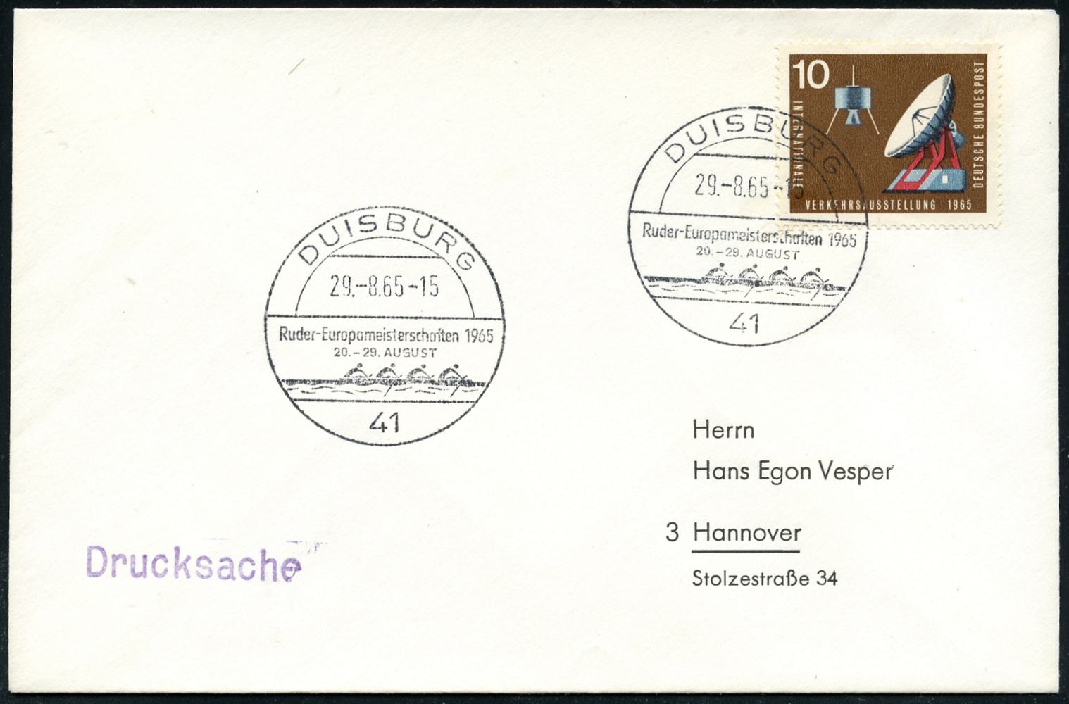 6822 | 12 € | 4100 Sonderstempel : 41 DUISBURG/ Ruder-Europameisterschaften/ 20.-29.AUGUST 1965 (Aug.) SSt = Rudern Vierer (ohne Steuermann) klar gest. Inl.-Bf. (Bo.41) | ![]() | |