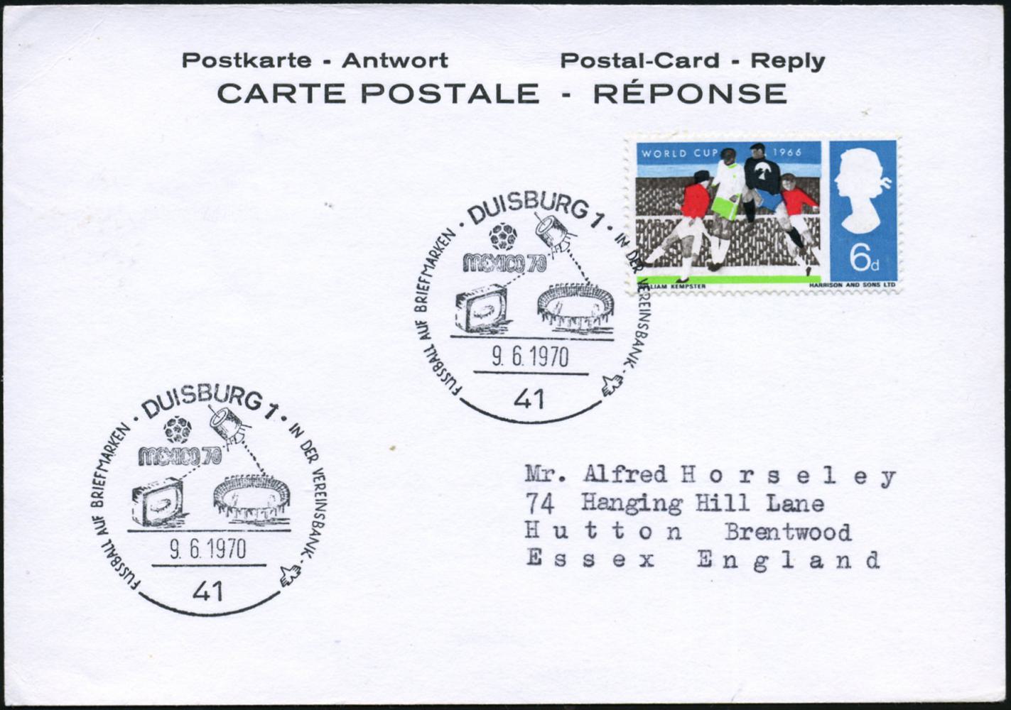 6826 | 20 € | 4100 Sonderstempel : 41 DUISBURG 1/ MEXICO/ FUSSBALL AUF BRIEFMARKEN/ IN DER VEREINSBANK 1970 (9.6.) SSt = Fußball, Stadion (u. TV-Satellit, TV-Gerät) a. EF Großbritannien 6 P. World Cup 1966 (Mi.423 x) zulässige Ausl.-Antwort-Kt. n. Großbritannien, Unikat! (Bo.71) | ![]() | |