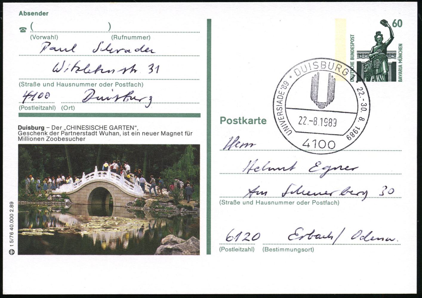 6830 | 14 € | 4100 Sonderstempel : 4100 DUISBURG 1/ UNIVERSADE 1989 (22.8.) SSt auf ortsgl. BiP 60 Pf. Bavaria: Duisburg Der "CHINESISCHE GARTEN" = chines. Brücke (im Zoo) Inl.-Kt., seltene Kombination (Mi.P 139) | ![]() | |