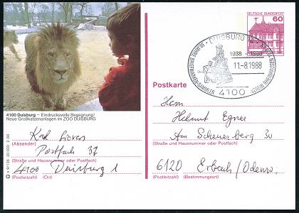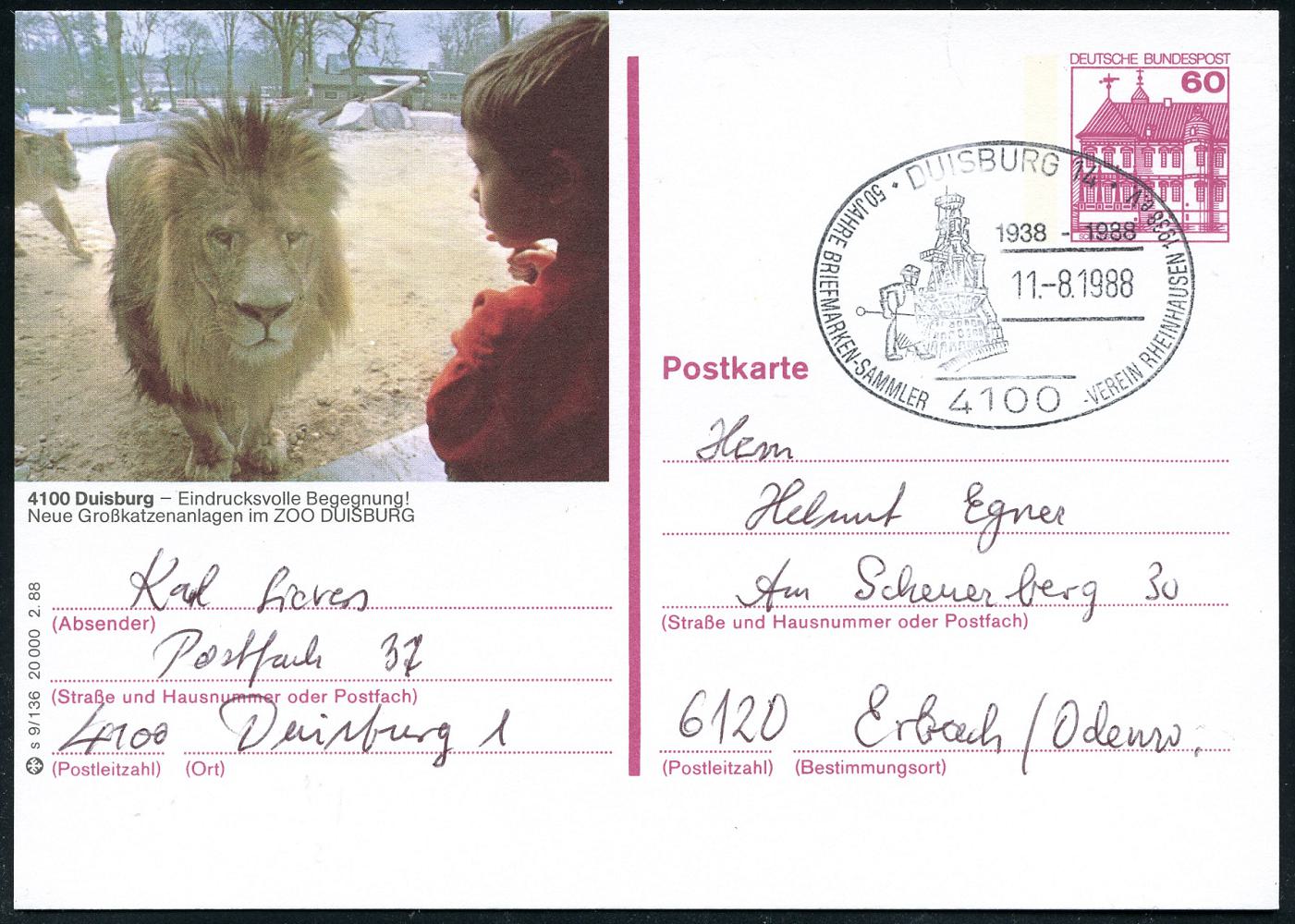 6829 | 14 € | 4100 Sonderstempel : 4100 DUISBURG 1/ 50 JAHRE BRIEFM.-SAMMLER-VEREIN RHEINHAUSEN.. 1988 (11.8.) SSt = Hüttenarbeiter u. Hochofen auf ortsgl. BiP 60 Pf. Burgen: 6100 Duisburg.. Neue Großkatzenanlagen im ZOO.. (Löwe) Inl.-Kt., seltene Kombination! (Mi.P 236) | ![]() | |