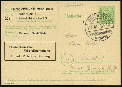6816 | 20 € | 4100 Sonderstempel : DUISBURG/ 2/ Philatelisten-/ Tagung 1946 (11.5.) SSt auf amtl. P 5 Pf. AM-Post, grün + Zudruck: BUND DEUTSCHER PHILATELISTEN.. Niederrhein. Philatelistentagung 11. u. Mai (Mi.PZD 904) Orts-Kt. (Bo.9) | ![]() | |