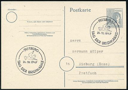 6818 | 12 € | 4100 Sonderstempel : DUISBURG/ TAG DER BRIEFMARKE 1947 (26.10.) SSt (Brieftaube ) 2x klar auf Inl.-Karte (Bo. 12) | ![]() | |
