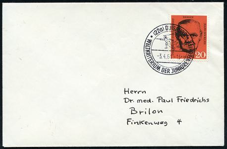 6820 | 15 € | 4100 Sonderstempel : (22a) DUISBURG/ WELTKRITERIUM DER JUNIORENFECHTER 1961 (3.4.) SSt (2 Fechter) klar auf Inl.-Bf. (Bo.23, Finaltag) | ![]() | |