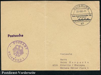 6823 | 10 € | 4100 Sonderstempel : 41 DUISBURG/ Ruder-Europameisterschaften/ 20.-29.AUGUST 1965 (20.8.) SSt = Rudern Vierer (ohne Steuermann) + viol., amtl. 1K-HdN: POSTAMT/o/DUISBURG 1, klar gest. (gefaltete) Postdienst-Vorderseite (Bo.41 = Eröffnungstag) | ![]() | |