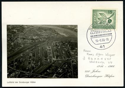 6824 | 15 € | 4100 Sonderstempel : 41 DUISBURG/ 250 JAHRE DUISBURGER HÄFEN 1966 (16.9.) SSt auf Jubil.-Sonder-Kt: mit orig. Luftbild-Foto des Hafens!, (vergl. Kat.-Nrn. 6814, (Bo.48) | ![]() | |