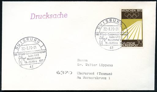 6827 | 16 € | 4100 Sonderstempel : 41 DUISBURG 1/ XIII.Billard-Europameisterschaft/ Cadre 47-1 1970 (22.3.) SSt (Billardspieler) klar gest. Inl.-Bf., gesuchte Thematik ! (Bo.68 Finaltag) | ![]() | |