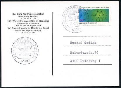 6828 | 18 € | 4100 Sonderstempel : 41 DUISBURG 1/ XV.Kanu-WM.. 1979 (16.8.) SSt auf passender Color-Sonder-Kt.: XV. KANU-WELTMEISTERSCHAFTEN (mit WM-Logo u. 4 Ansichten der Regattastrecke) Inl.-Kt. | ![]() ![]() | |
