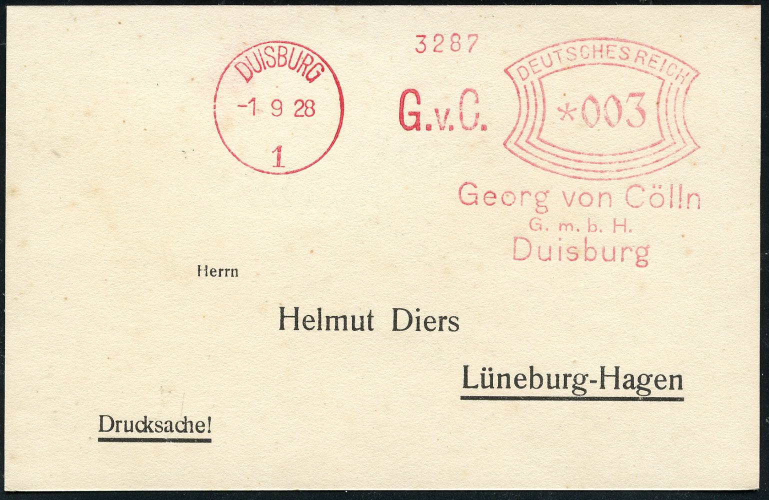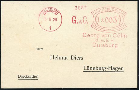 6864 | 20 € | 4100 Duisburg Absender-Freistempel : DUISBURG/ 1/ G.v.C./ Georg von Cölln/ GmbH.. 1928 (1.9.) AFS Francotyp "Bogenrechteck" auf Inl.-Drs.-Karte (Dü.E-1Ah) | ![]() | |