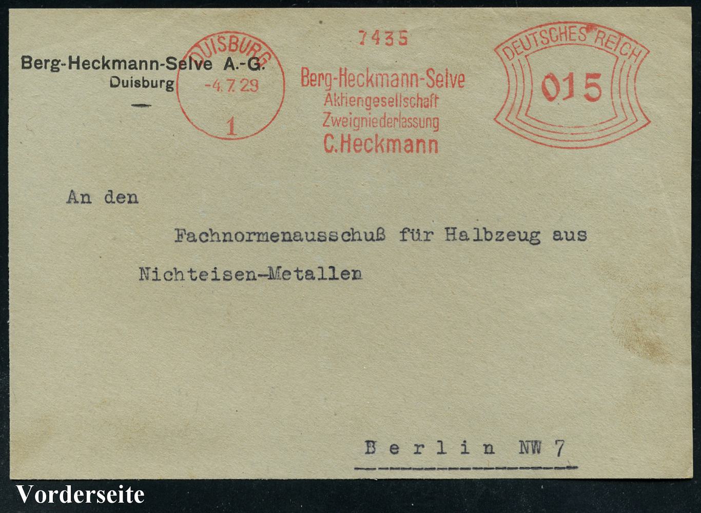 6866 | 14 € | 4100 Duisburg Absender-Freistempel : DUISBURG/ 1/ Berg-Heckmann-Selve/ AG.../ C,Heckmann 1929 (4.7.) AFS Francotyp "Bogenrechteck" auf kleiner Firmen-Vorderseite (Dü.E-1BAh) | ![]() | |