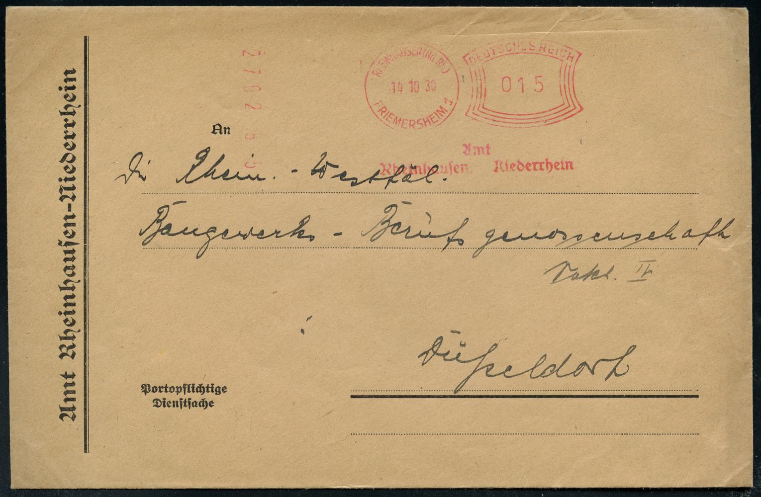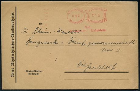 6871 | 25 € | 4100 Duisburg Absender-Freistempel : Duisburg-Rheinhausen 1930 (14.10.) seltener AFS-Typ Komusina "Bogenrechteck": RHEINHAUSEN (Nd. Rh.)/FRIEMERSHEIM 1/Amt/RHEINHAUSEN.. , Dienst-Dienst-Bf.: Amt Rheinhausen.. (rs.Klappenriß) Fern-Bf. (Dü.E-1 Ko) | ![]() | |