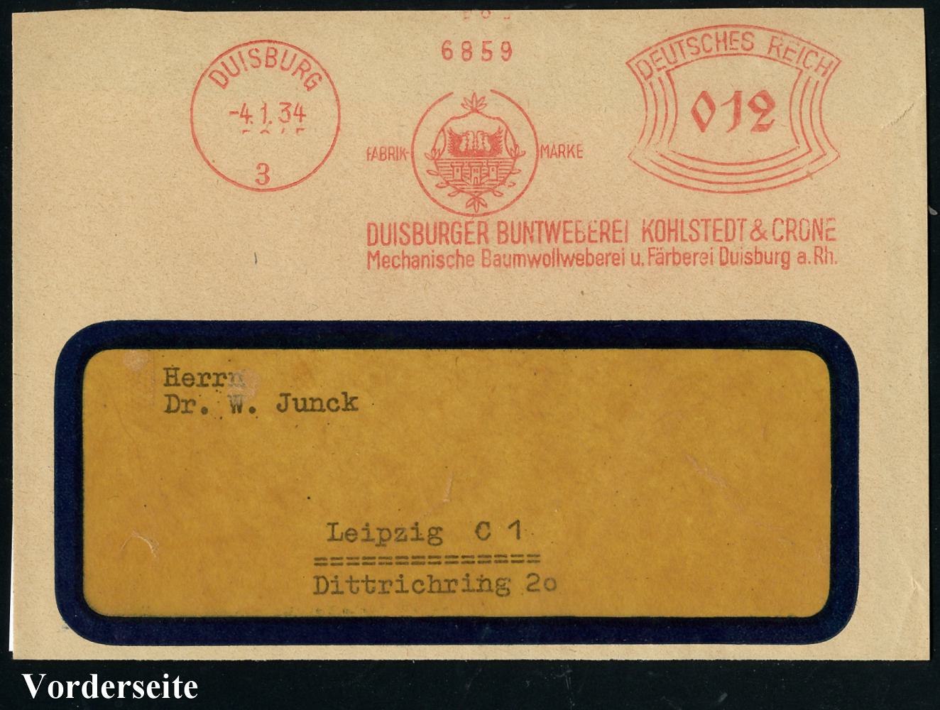 6874 | 12 € | 4100 Duisburg Absender-Freistempel : DUISBURG/ 3/ ..DUISBURGER BUNTWEBEREI KOHLSTEDT & CRONE/ Mechan.Baumwollweberei u. Färberei.. 1934 (4.1.) AFS Francotyp "Bogenrechteck" (Firmen-Logo: Wappen) kleine Bedarfs-Vorderseite (Dü.E-1BAh) | ![]() | |
