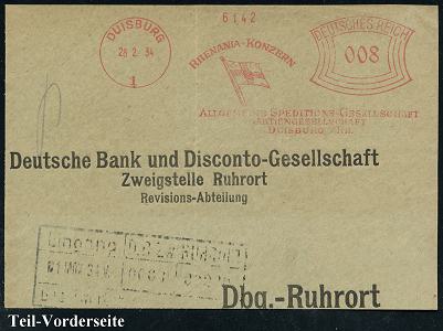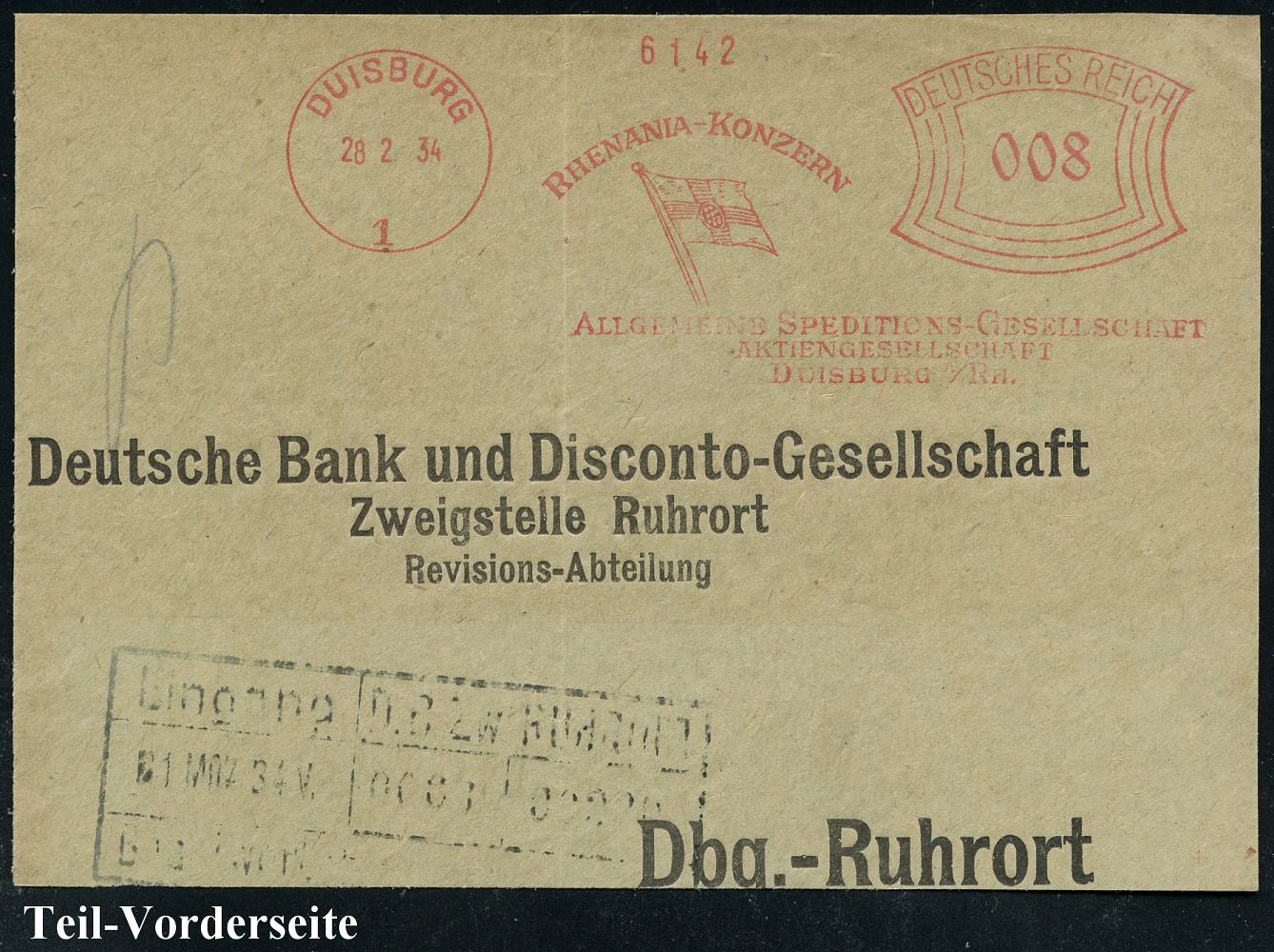 6876 | 14 € | 4100 Duisburg Absender-Freistempel : DUISBURG/ 1/ RHENANIA-KONZERN/ ALLGEM.SPEDITIONS-GES./ AG.. 1934 (28.2.) AFS Francotyp "Bogenrechteck" (Firmen-Flagge) Bedarfs-Teil-Vorderseite, vergl. Kat.-Nr. 6869 (Dü.E-1CEh) | ![]() | |