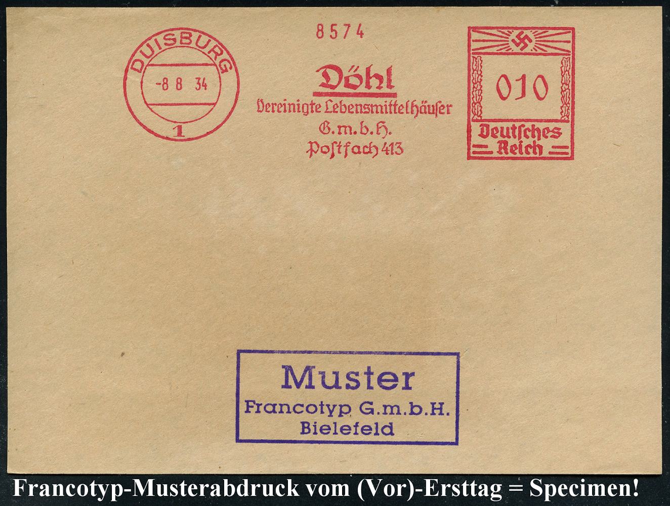 6877 | 35 € | 4100 Duisburg Absender-Freistempel : DUISBURG/ 1/ Döhl/ Vereinigte Lebensmittelhäuser/ GmbH.. 1934 (8.8.) AFS-Musterabdruck Francotyp "Hakenkreuz" , glasklar gest. Francotyp-Musterblatt vom (Vor)-Ersttag !, selten! (Dü.E-CEh) | ![]() ![]() | |