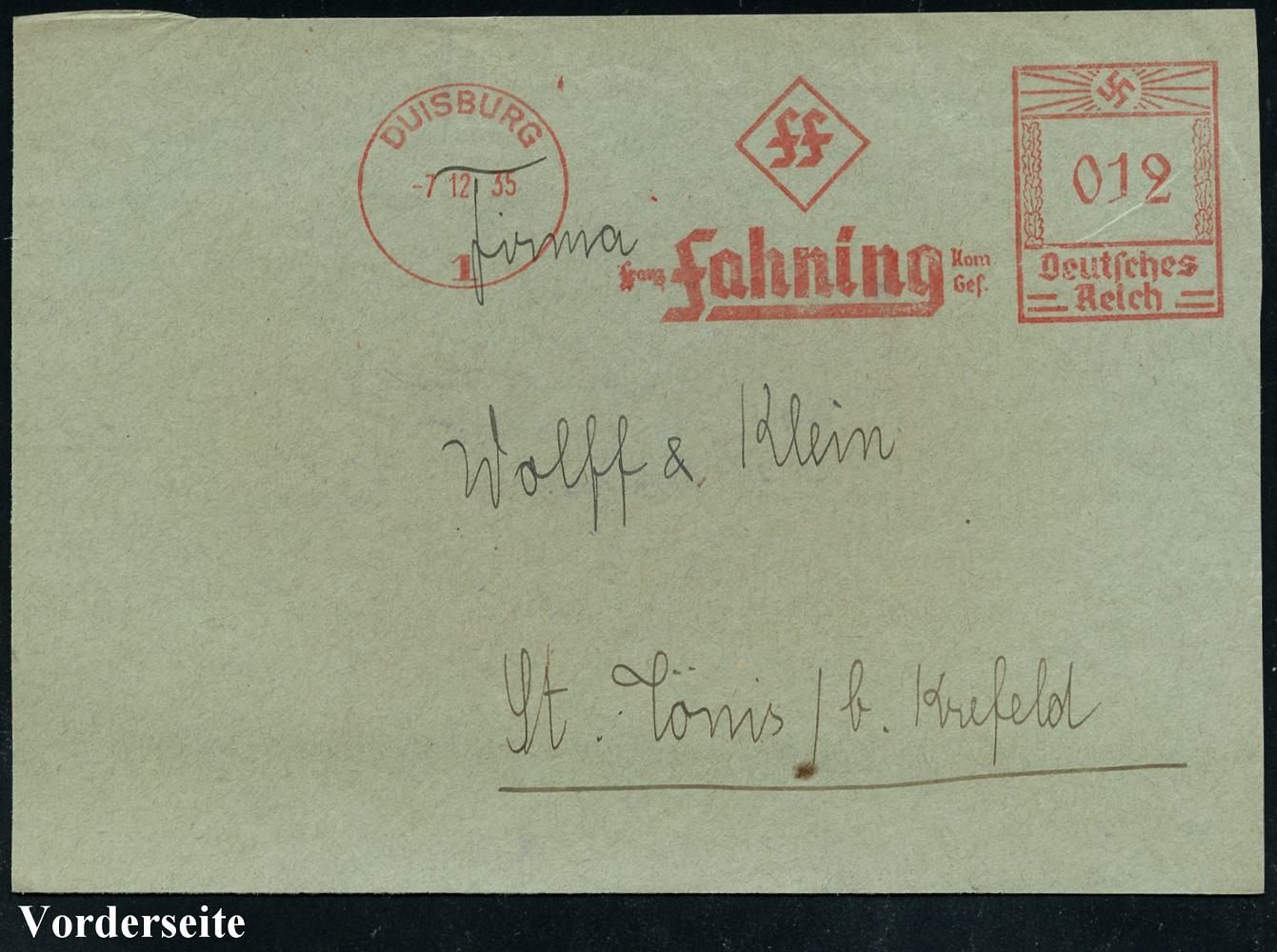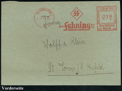 6882 | 14 € | 4100 Duisburg Absender-Freistempel : DUISBURG/ 1/ FF/ Franz Fahning KG 1935 (7.12.) AFS Francotyp "Hakenkreuz" auf Bedarfs-Vorderseite (Dü.E-3CEo) | ![]() | |