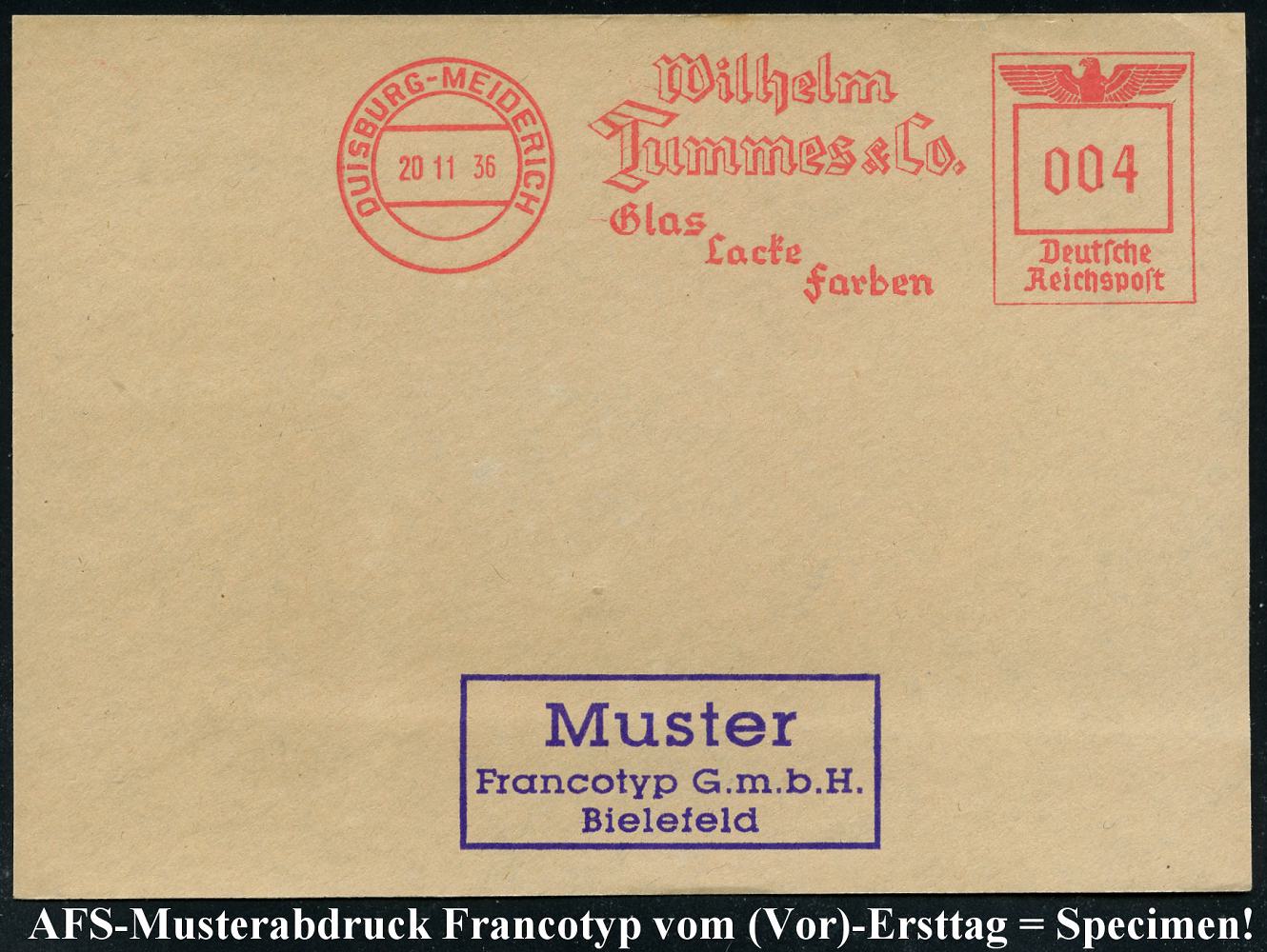 6885 | 35 € | 4100 Duisburg Absender-Freistempel : DUISBURG-MEIDERICH/ Wilhelm/ Tummes & Co./ Glas/ Lacke/ Farben 1936 (20.11.) AFS-Musterabdruck Francotyp "Reichsadler" , glasklar gest. Francotyp-Musterblatt vom (Vor)-Ersttag !, selten! (Dü.E-5CGo) | ![]() ![]() | |