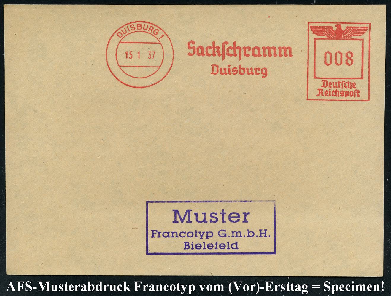 6886 | 35 € | 4100 Duisburg Absender-Freistempel : DUISBURG 1/ Sachschramm.. 1937 (15.1.) AFS-Musterabdruck Francotyp "Reichsadler" , glasklar gest. Francotyp-Musterblatt vom (Vor)-Ersttag !, selten! (Dü.E-5CGo) | ![]() ![]() | |