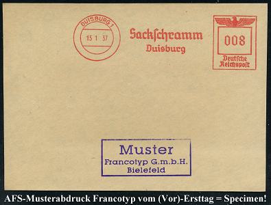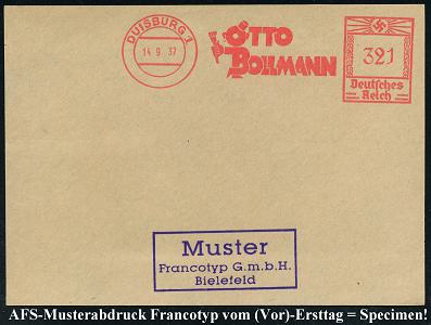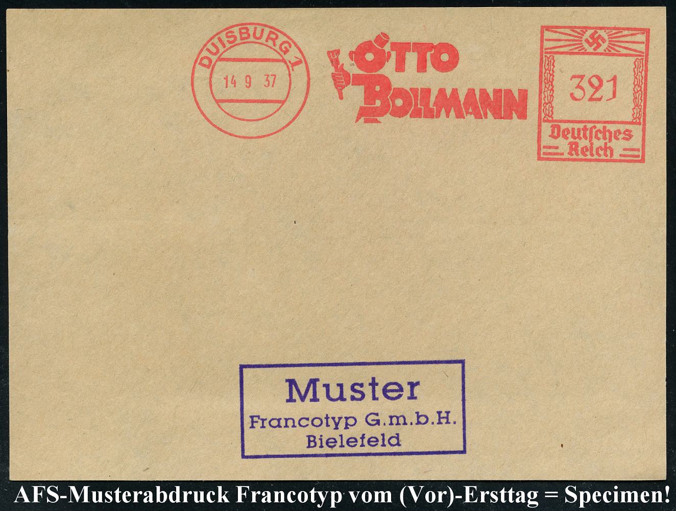 6889 | 35 € | 4100 Duisburg Absender-Freistempel : DUISBURG 1/ OTTO/ BOLLMANN 1937 (14.9.) AFS-Musterabdruck Francotyp "Hakenkreuz" (Buchstabenfigur mit Maler-Pinsel) glasklar gest. Francotyp-Musterblatt vom (Vor)-Ersttag !, selten! (Dü.E-3CEo) | ![]() ![]() | |
