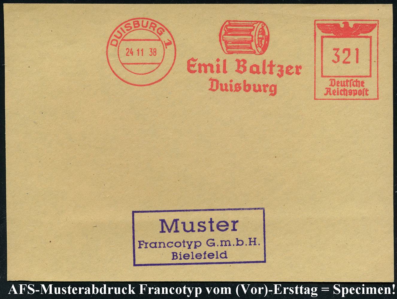 6894 | 35 € | 4100 Duisburg Absender-Freistempel : DUISBURG 1/ Emil Baltzer.. 1938 (24.11.) AFS-Musterabdruck Francotyp "Reichsadler" (Metall-Teil) glasklar gest. Francotyp-Musterblatt vom (Vor)-Ersttag !, selten! (Dü.E-5CGo) | ![]() ![]() | |