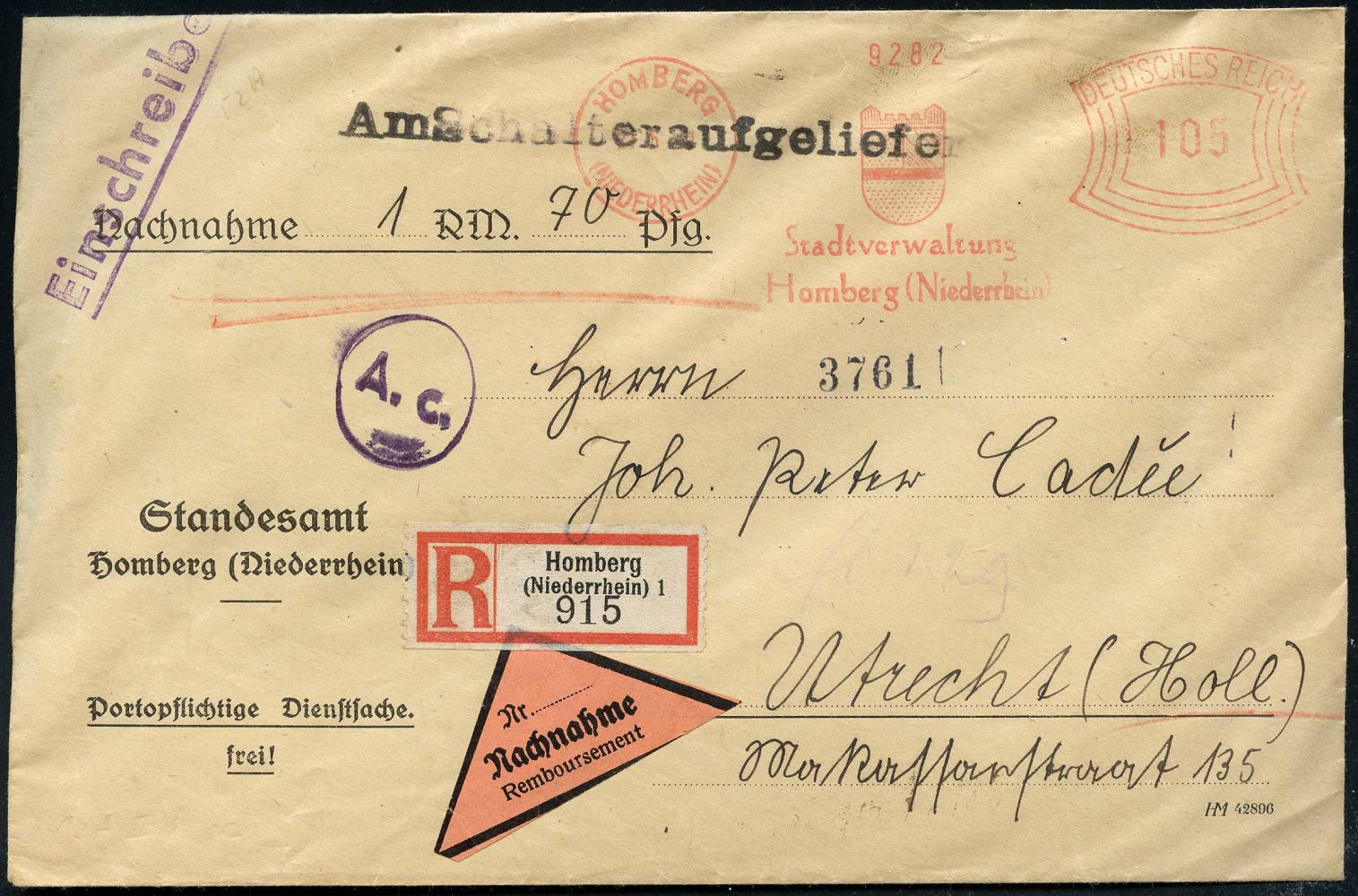 6896 | 65 € | 4100 Duisburg Absender-Freistempel : Duisburg-Homberg 1941 (21.5.) AFS Francotyp "Bogenrechteck": HOMBERG/(NIEDERRHEIN)/Stadtverwaltung/Homberg.. 105 Pf. (Stadtwappen) + RZ: Homberg/ (Niederrhein) 1 + viol. OKW-Zensur-1K: A. c. = Köln (rs. Zensurstreiefn entfernt) + 1L: Am Schalter aufgeliefert, Dienst-Ausl.-NN-Zensur-R-Bf. n. Utrecht, sehr seltene Portostufe! (Dü.E-1CGh) | ![]() | |
