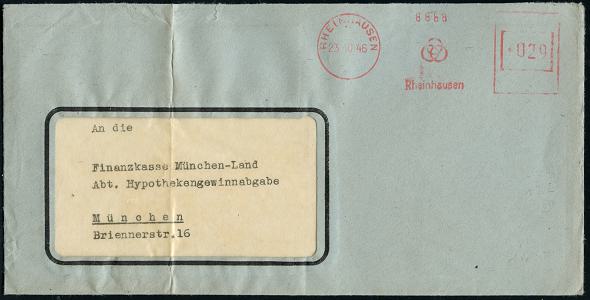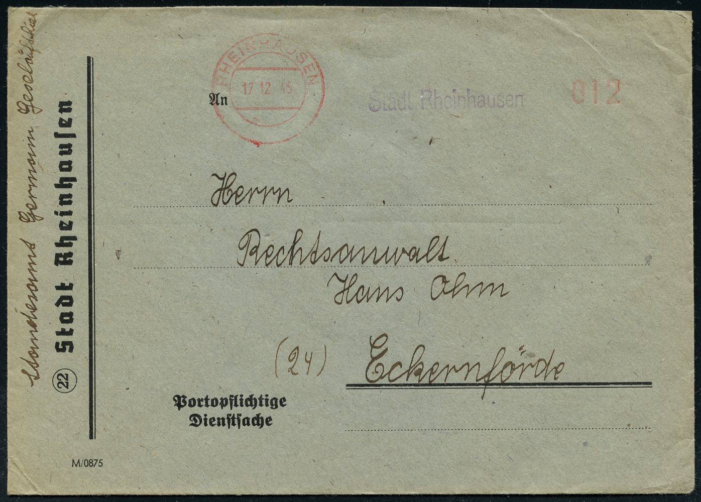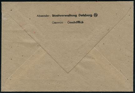 6900 | 28 € | 4100 Duisburg Absender-Freistempel : Duisburg-Rheinhausen 1945 (17.12.) seltener, total aptierter AFS Francotyp "Reichsadler", Wertrahme total entfernt = Notmaßnahme! + zugestempelter Abs.-1L: Stadt Rheinhausen, Dienst-Bf.: (22) Stadt Rheinhausen (Dü.E-16-242o) | ![]() | |