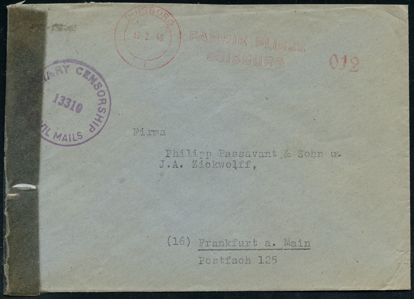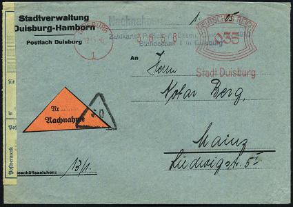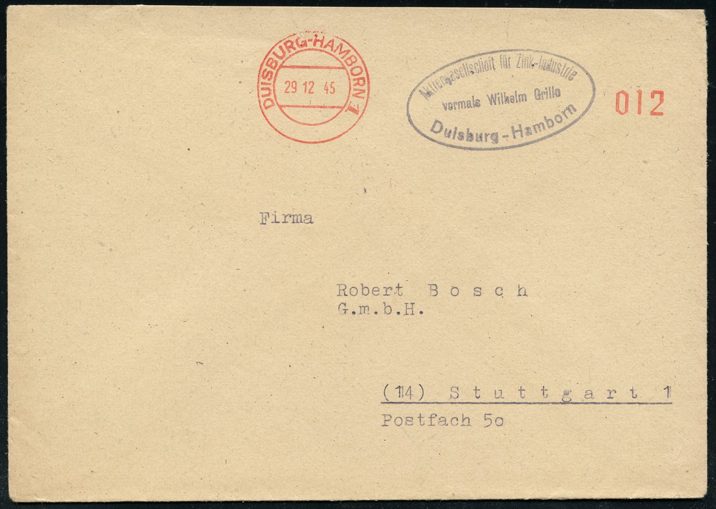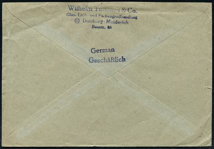 6902 | 30 € | 4100 Duisburg Absender-Freistempel : DUISBURG-HAMBORN 1 1945 (29.12.) seltener, total aptierter AFS Francotyp "Reichsadler", Wertrahme total entfernt = Notmaßnahme! + zugestempelter Abs.-Oval: AG für Zink-Industrie, vormals Wilhelm Grillo.. (auch rs. Abs.-5L) klar gest. Fern-Bf. (Dü.E-16-242o) | ![]() | |