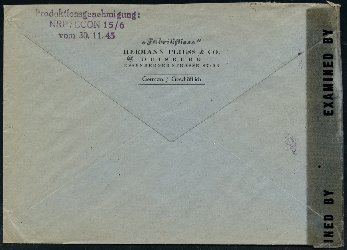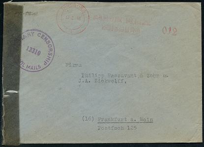 6905 | 28 € | 4100 Duisburg Absender-Freistempel : DUISBURG/ 1/ FABRIK FLIESS.. 1946 (12.2.) seltener, total aptierter AFS Francotyp "Reichsadler", Wertrahmen total entfernt = Notmaßnahme! + viol. US-Zensur-1K: MILITARY CENSORSHIP/ 13310/ CIVIL MAILS + Zensurstreifen: EXAMINED BY = Offenbach (Rie,A-1, A-101) Zenur-Inl.-Bf. n. Ffm., vergl. Kat.-Nr.6899 (Dü.E-16-241o) | ![]() ![]() | |