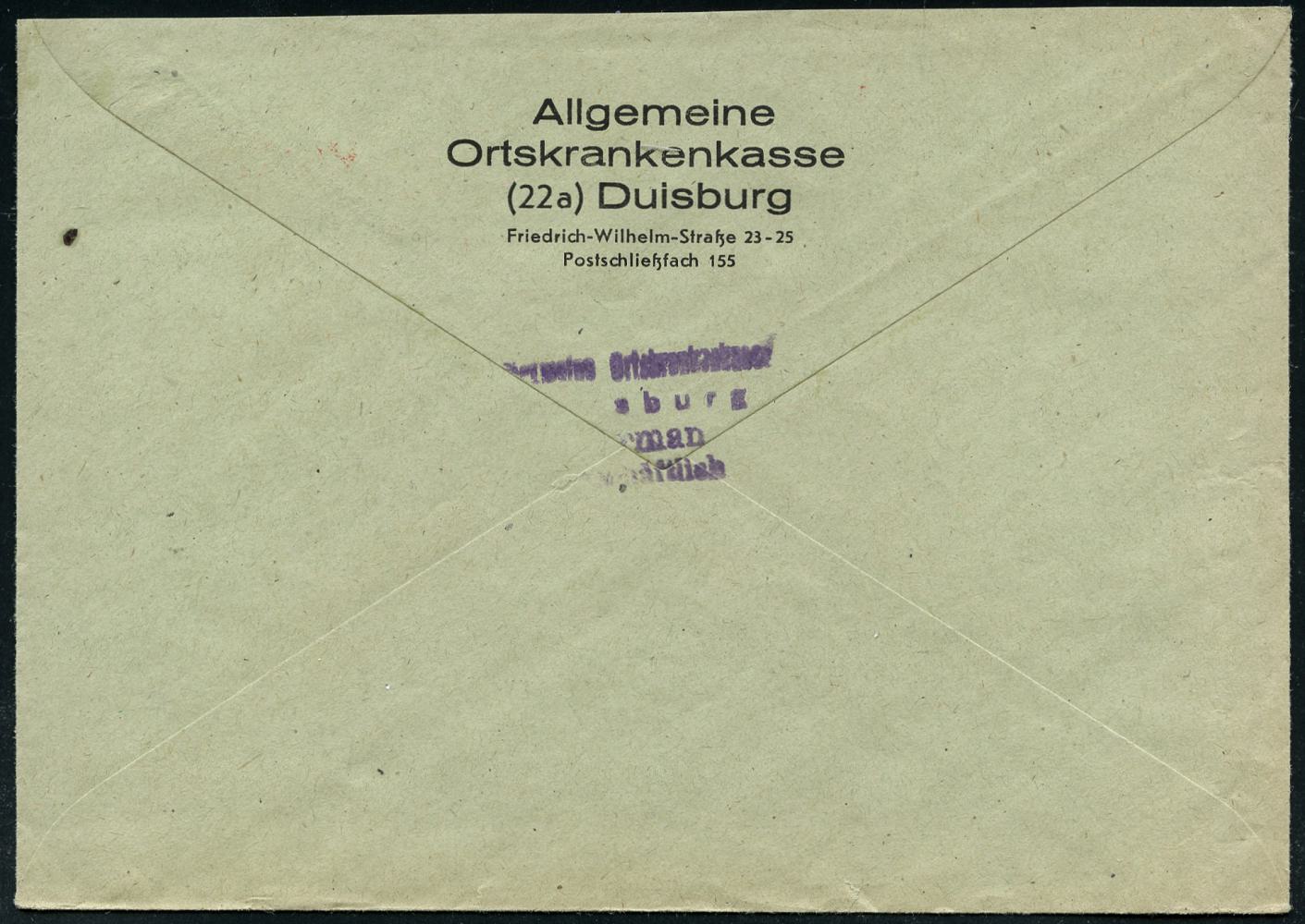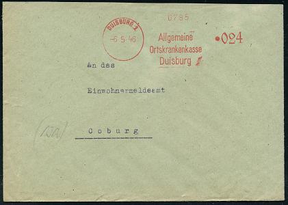 6907 | 28 € | 4100 Duisburg Absender-Freistempel : DUISBURG 1/ Allgem./ Ortskrankenkasse.. 1946 (6.5.) seltener, total aptierter AFS Francotyp "Reichsadler", Wertrahmen total entfernt = Notmaßnahme! , rs. Abs.-Vordruck, Fern-Bf. n. Coburg (Dü.E-16-234h = A mit Punkt) | ![]() ![]() | |