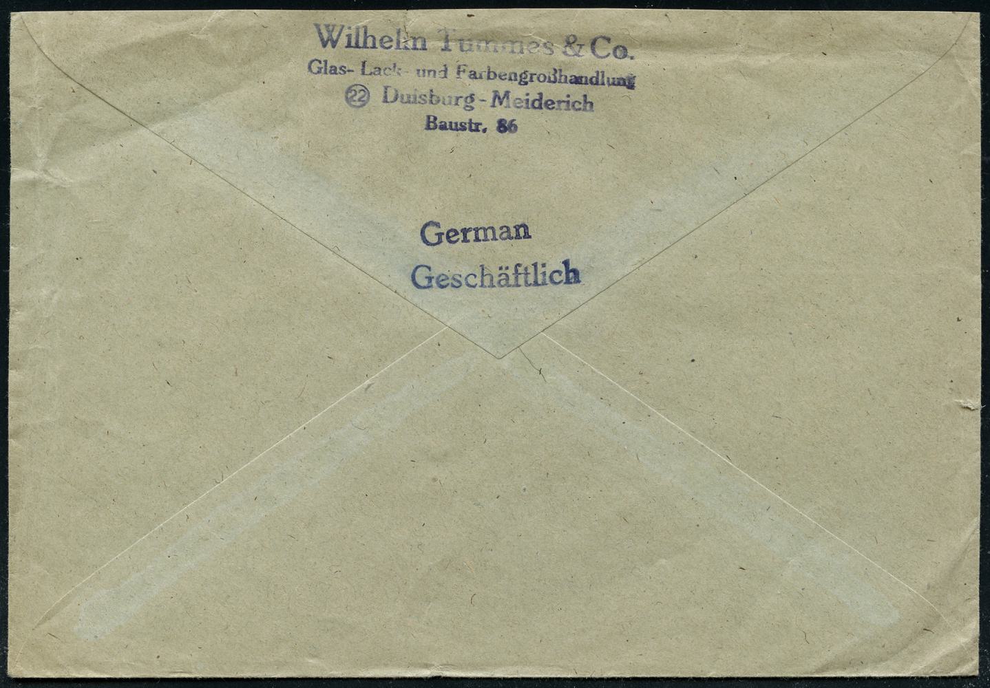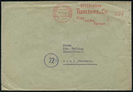 6910 | 28 € | 4100 Duisburg Absender-Freistempel : DUISBURG-MEIDERICH/ Wilhelm/ Tummes & Co/ Glas/ Lacke/ Farben 1946 (21.11.) seltener, total aptierter AFS Francotyp "Reichsadler", Wertrahmen total entfernt = Notmaßnahme! , rs. Abs.-4L, Fern-Bf. n. Goch, vergl. Kat.-Nr.6885 (Dü.E-16-242o) | ![]() ![]() | |