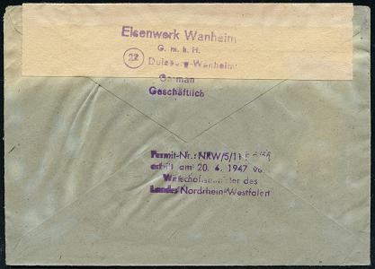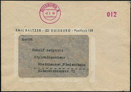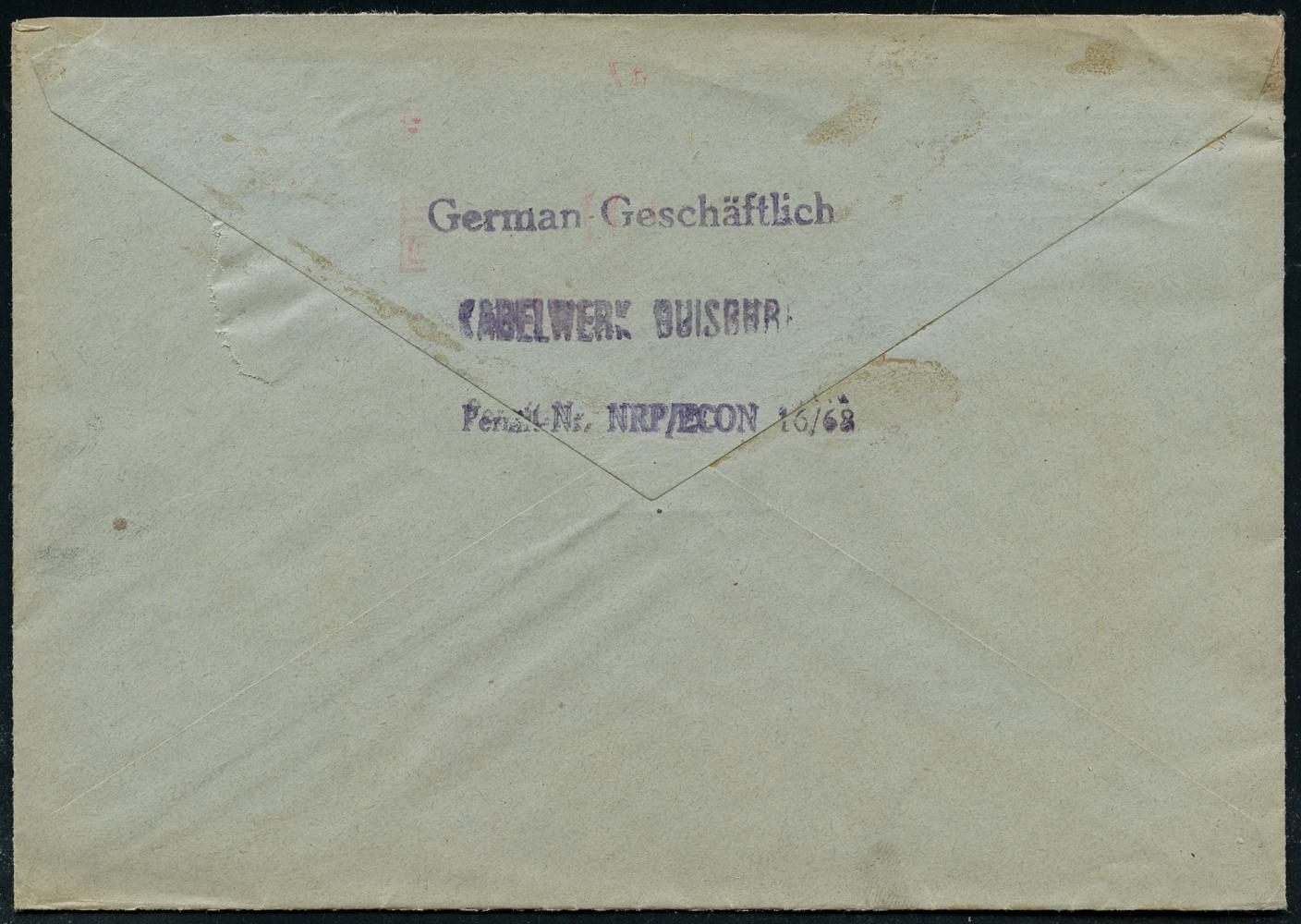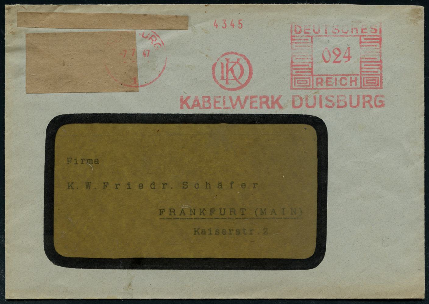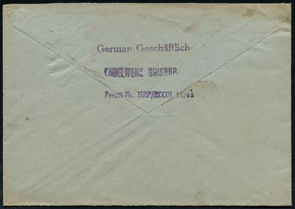 6912 | 30 € | 4100 Duisburg Absender-Freistempel : DUISBURG/ 1/ KD/ KABELWERK DUISBURG 1947 (7.7.) AFS Francotyp "Mäanderrechteck" unverändert weiterverwendet mit Inschrift "DEUTSCHES REICH" = Notmaßnahme! , Firmen-Bf. mit überklebter Adresse, rs. Abs.-HdN, seltener Fern-Bf. (Dü.E-2CEh, unverändert weiterverwendet) | ![]() ![]() | |
