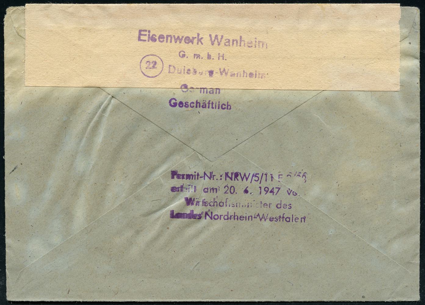 6913 | 30 € | 4100 Duisburg Absender-Freistempel : DUISBURG-WANHEIM/ Eisenwerk/ Wanheim/ gmbH 1947 (4.12.) AFS Francotyp "Mäanderrechteck" unverändert weiterverwendet mit Inschrift "DEUTSCHES REICH" = Notmaßnahme! , rs. Abs.-HdN, doppelt verwendeter Recycling-Orts-Bf. (Dü.E-2BAo, unverändert weiterverwendet) | ![]() ![]() | |