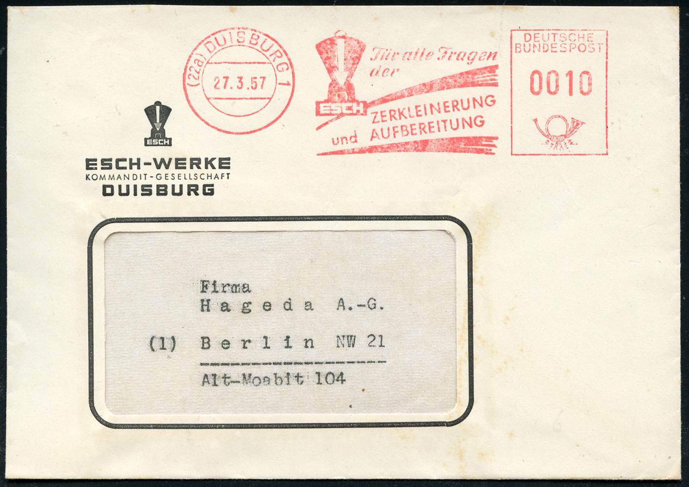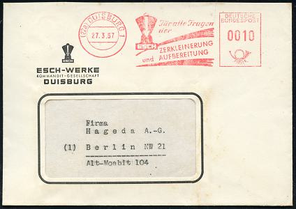 6916 | 16 € | 4100 Duisburg Absender-Freistempel : (22a) DUISBURG 1/ ..ESCH/ ZERKLEINERUNG/ und AUFBEREITUNG 1957 (27.3.) AFS Francotyp, vierstellig (Firmen-Logo) motivgl. Firmen-Bf.: ESCH-WERKE KG.. (Dü.E-23CO, vierstellig) | ![]() | |