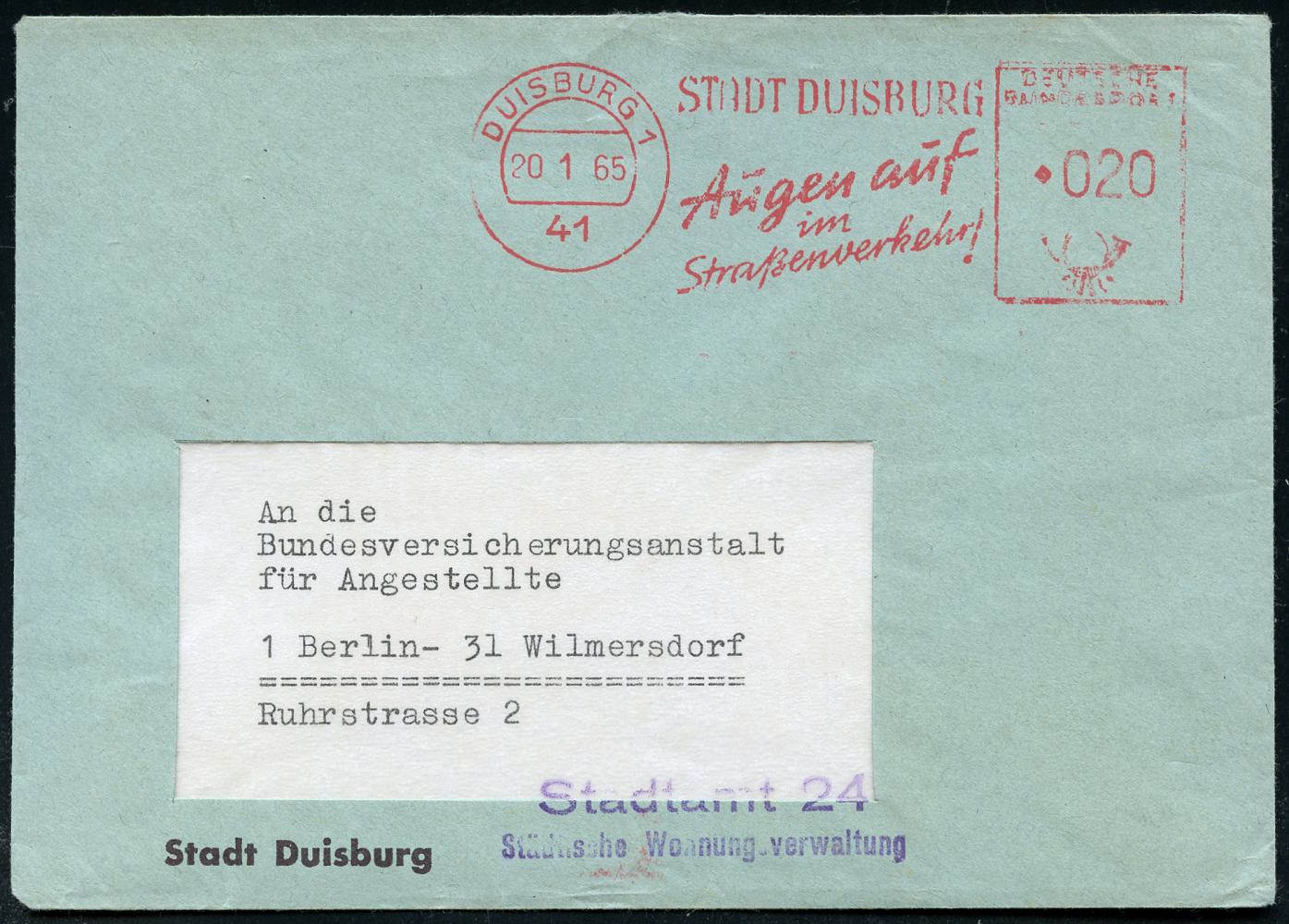 6925 | 8 € | 4100 Duisburg Absender-Freistempel : 41 DUISBURG 1/ STADT DUISBURG/ Augen auf/ im/ Straßenverkehr! 1965 (20.1.) AFS Francotyp + viol. Abs.-2L: Stadtamt 24/ Städt. Wohnungsverwaltung , Fern-Bf. (Dü.E-23DO mit Raute) | ![]() | |