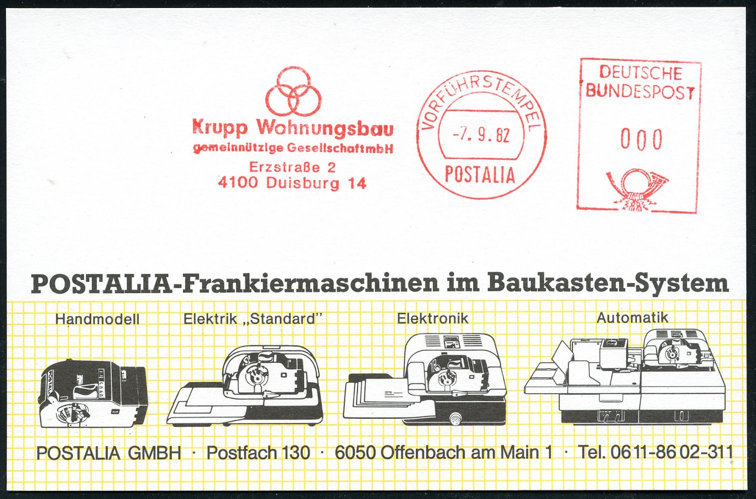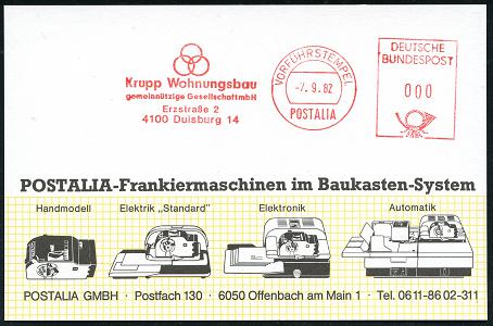 6932 | 18 € | 4100 Duisburg Absender-Freistempel : 4100 Duisburg 14 1982 (7.9.) AFS.: POSTALIA/VORFÜHRSTEMPEL/Krupp Wohnungsbau.. (Krupp-Logo) seltene Postalia-Muster-Kt. (= Specimen) | ![]() | |