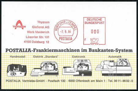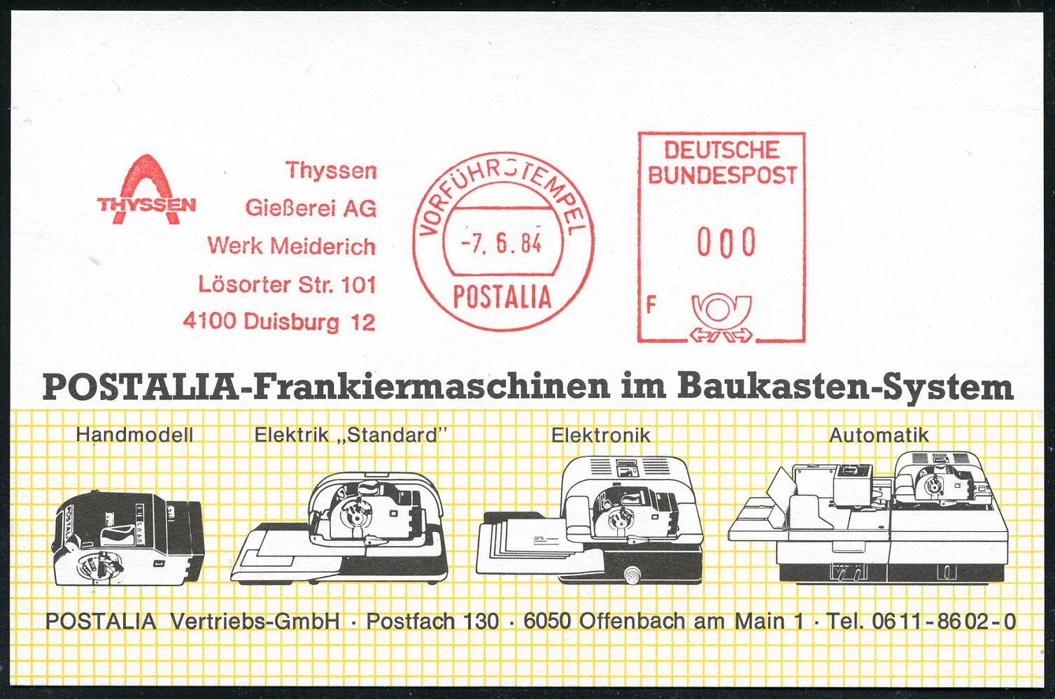 6933 | 18 € | 4100 Duisburg Absender-Freistempel : 4100 Duisburg 12 1984 (7.6.) AFS.: POSTALIA/VORFÜHRSTEMPEL/Thyssen/Gießerei AG/Werk Meiderich.. (Firmen-Logo) seltene Postalia-Muster-Kt. (= Specimen) | ![]() | |