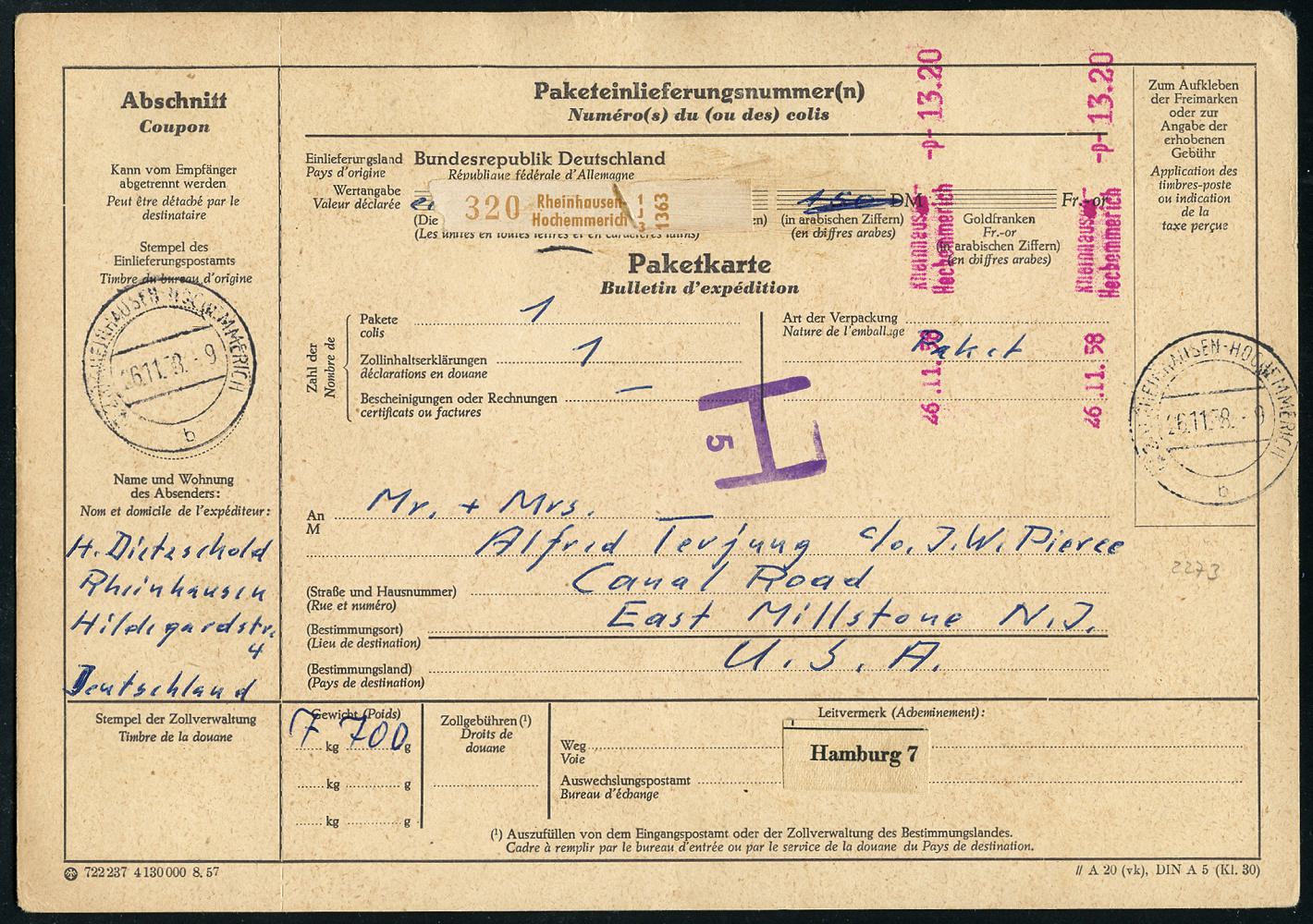 6919 | 20 € | 4100 Duisburg Absender-Freistempel : Duiburg-Rheinhausen-Hochemmerich 1958 (26.11.) viol. Registrierkassen-Paketfreistempel: Rheinhausen/ Hochemmerich - p - (13,20 DM) 2x + brauner Paketzettel: Rheinhausen-/Hochemmerich etc., seltene Übersee-Paketkt. n. USA, seltene Portostufe! (Dü.H-1B, Ort zweizeilig) | ![]() | |