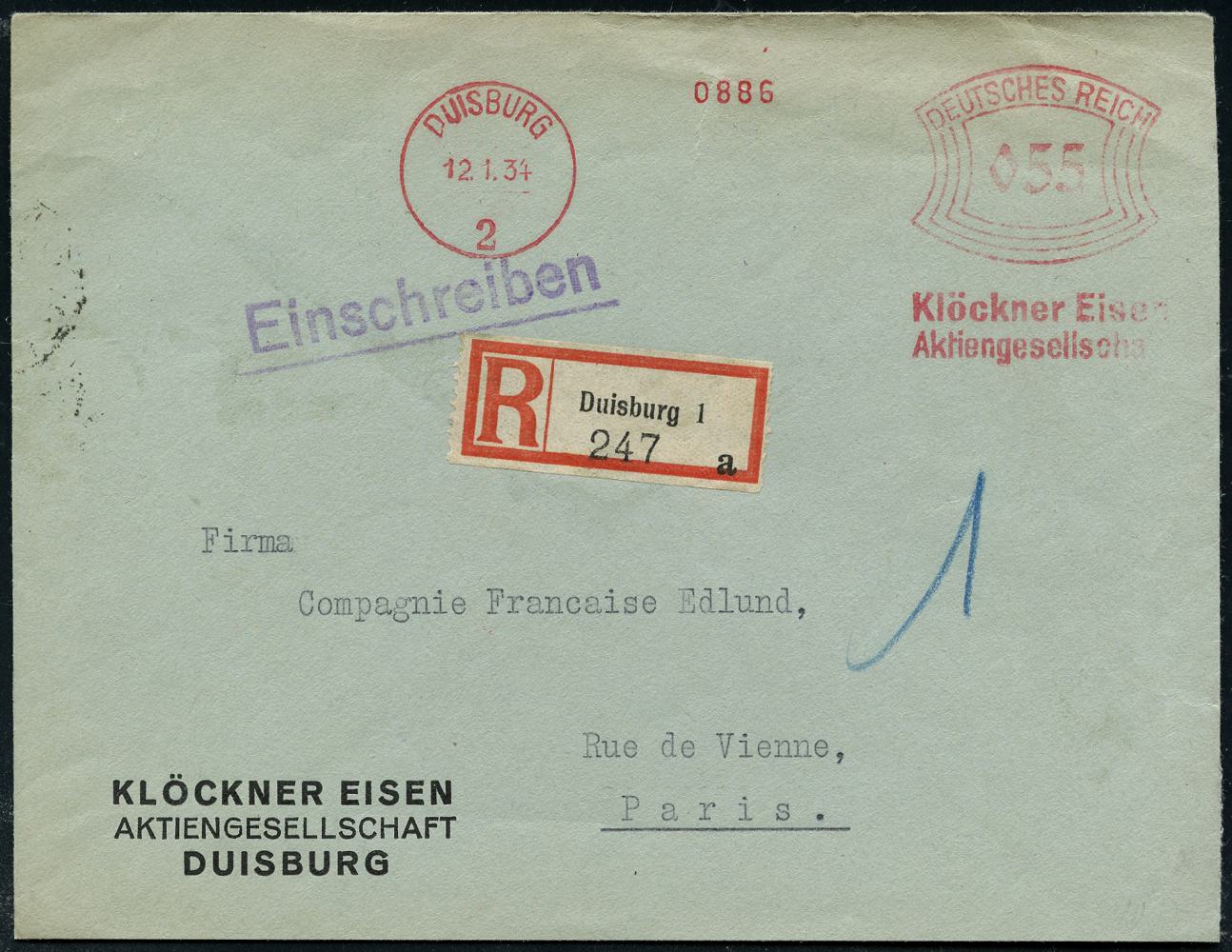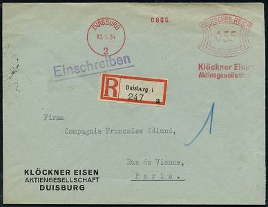 6875 | 30 € | 4100 Duisburg Absender-Freistempel : DUISBURG/ 2/ Klöckner Eisen/ AG 1933 (Aug.) AFS Francotyp "Bogenrechteck" 055 Pf. + RZ: Duisburg 1 auf Firmen-Bf.: KLÖCKNER EISEN AG = Hersteller Schiffs- u. LKW-Motoren, Militär-Kfz. etc., Ausl.-R-Bf. n.Paris!, seltenes Porto! (Dü.E-1BAh) | ![]() | |