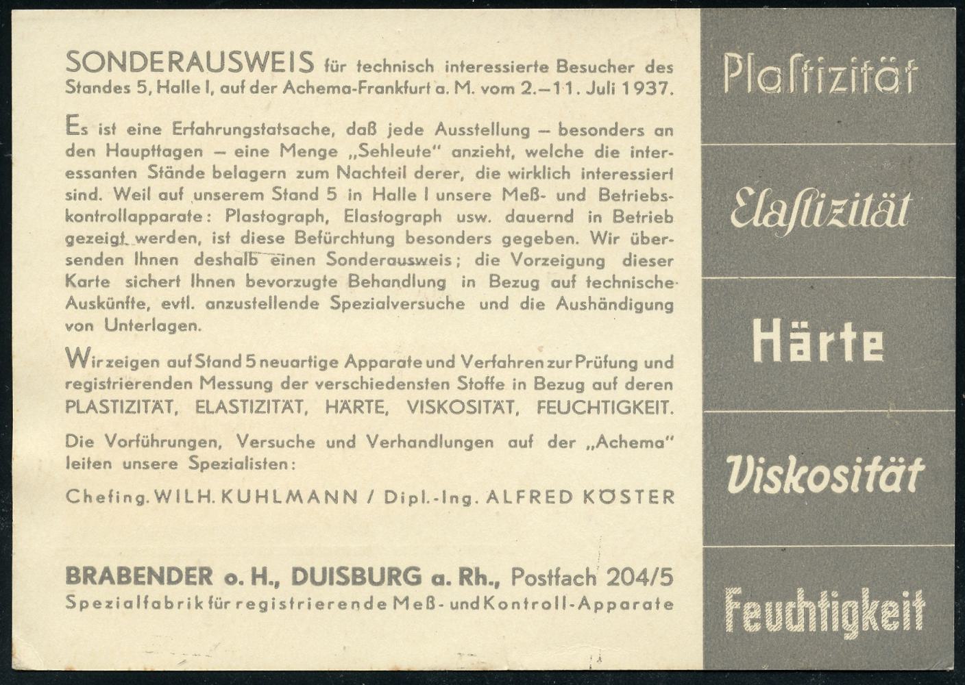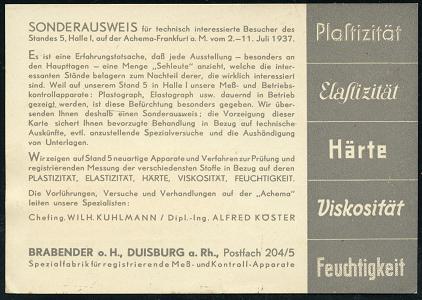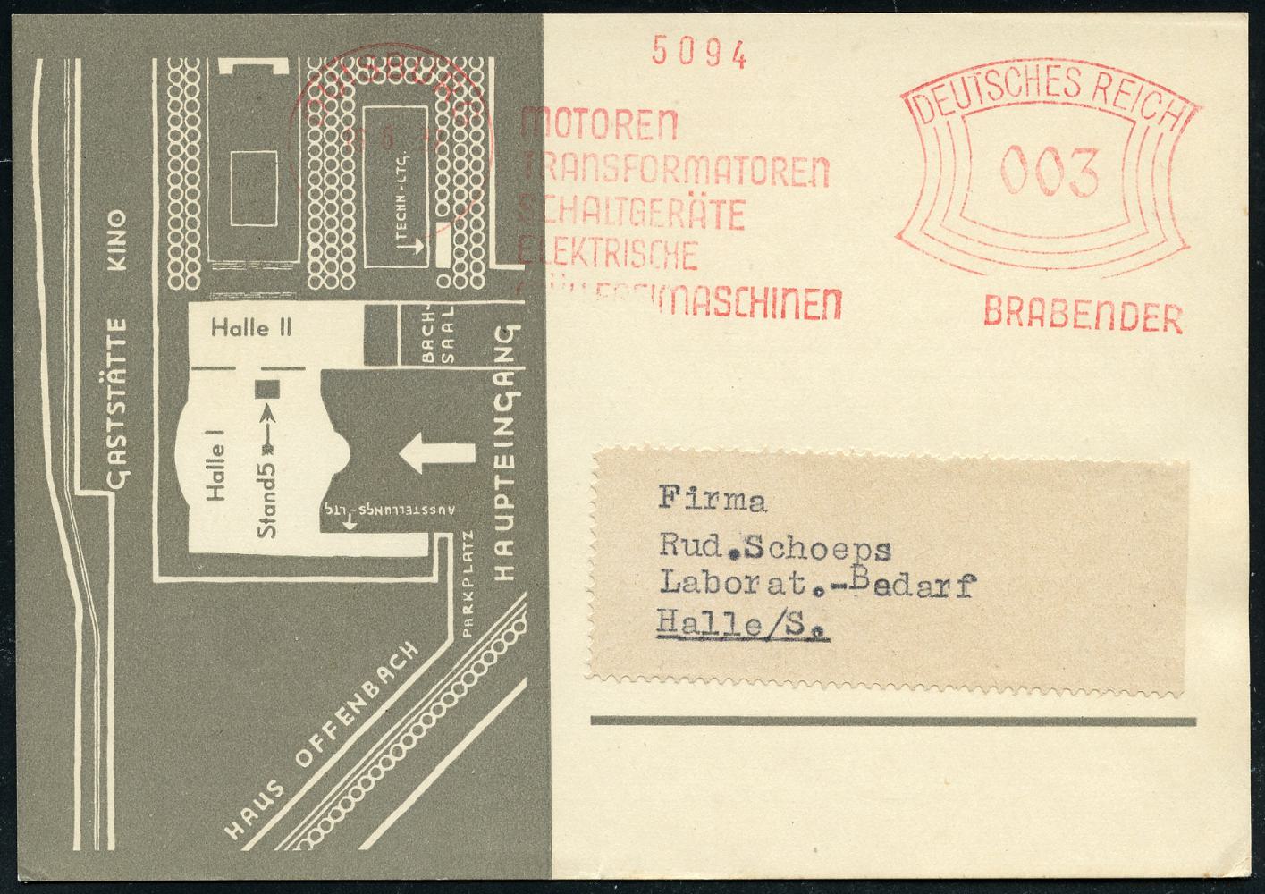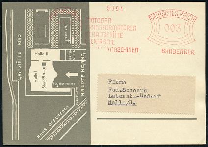 6887 | 25 € | 4100 Duisburg Absender-Freistempel : DUISBURG/ 1/ MOTOREN/ TRANSFORMATOREN/ SCHALTGERÄTE../ BRABENDER 1937 (16.6.) AFS Francotyp "Bogenrechteck" auf Reklame-Kt.: Achema Frankfurt/M. = Chemie-Messe (Grundriß Messehalle) n. Halle/S. (Dü.E-1CEh) | ![]() ![]() | |