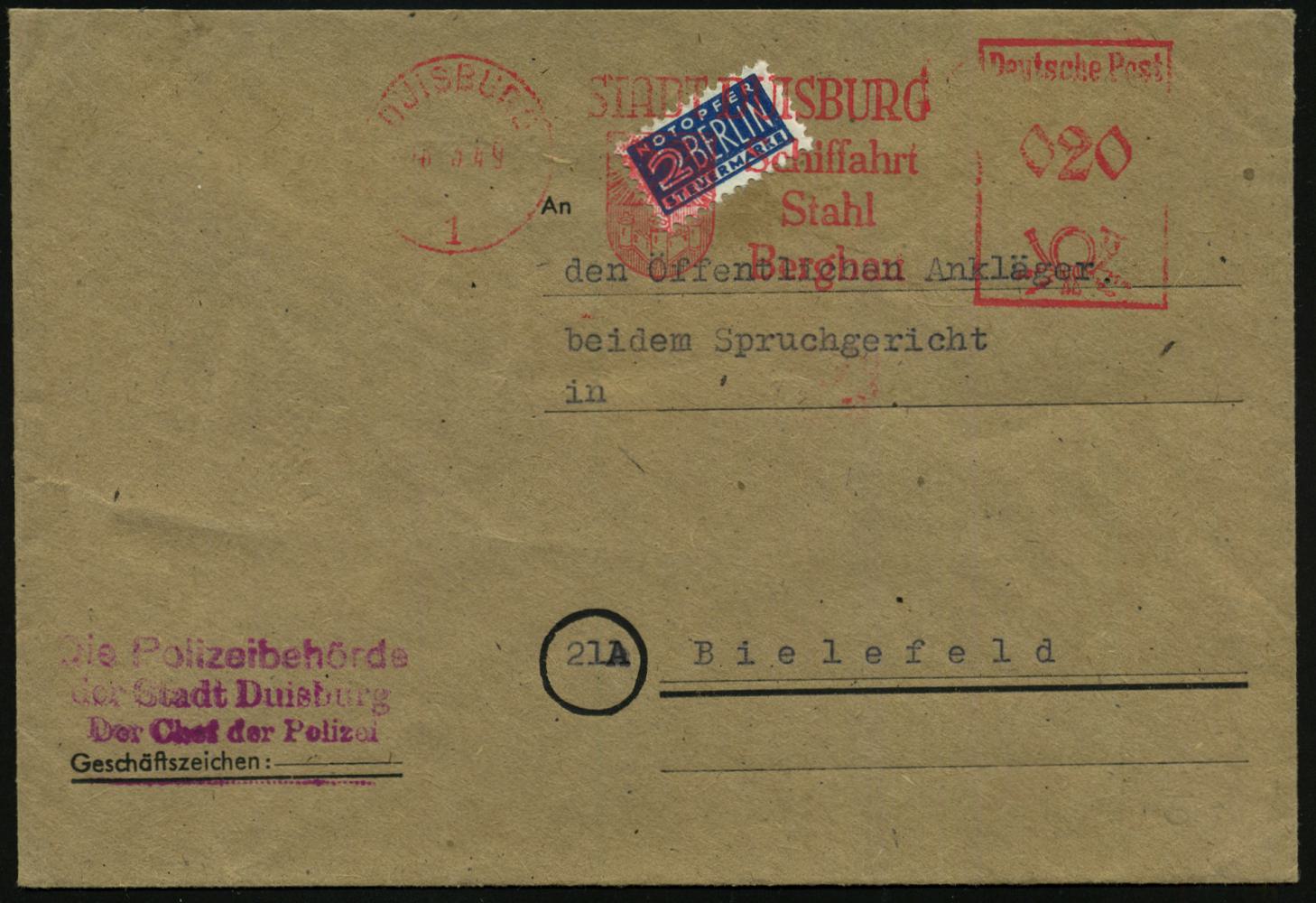 6914 | 18 € | 4100 Duisburg Absender-Freistempel : DUISBURG/ 1/ STADT DUISBURG/ Schiffahrt/ Stahl/ Bergbau 1949 (10.8.) AFS Francotyp "Posthorn" auf 2 Pf. NoB = Vorausentwertung + roter Abs.-3L: Die Polizeibehörde/..Der Chef der Polizei, Fern-Bf. an das Spruchgericht in Bielefeld = Entnazifizierungs-Gereicht! (Dü.E-20BAo) | ![]() ![]() | |