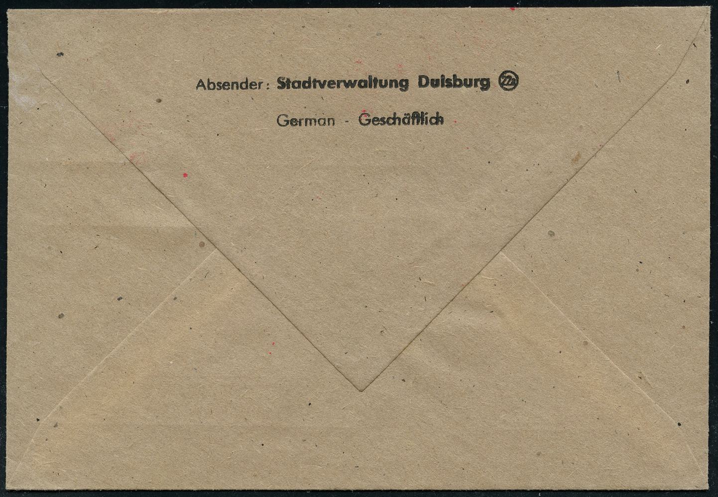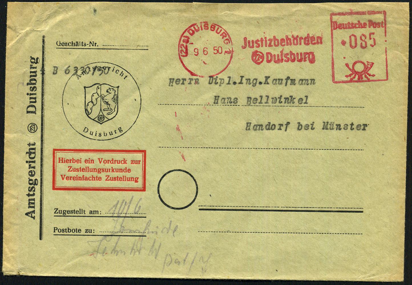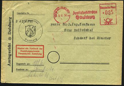 6915 | 18 € | 4100 Duisburg Absender-Freistempel : (22a) DUISBURG 1/ Justizbehörden 1950 (9.6.) AFS Francotyp "Posthorn" 085 Pf. auf Kommunal-Bf.: Amtsgericht.. Zustellungsurkunde Vereinfachte Zustellung (Bf. oben kl. Riß geschl.) Fern-Postauftrags-ZU., seltene Portostufe (Dü.E-20DGo) | ![]() | |