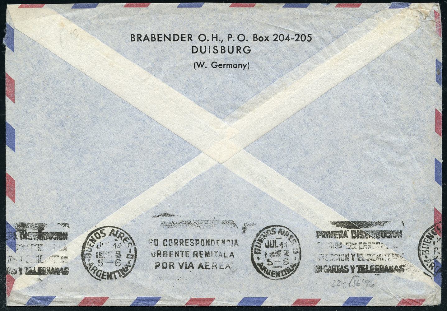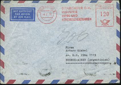 6920 | 25 € | 4100 Duisburg Absender-Freistempel : DUISBURG 1/ BRABENDER O.H./ INDUSTRIE/ MESS-U./ KONTROLLVERFAHREN 1959 (8.7.) AFS Francotyp 120 Pf. , rs. Abs.-Vordruck, Übersee-Flp.-Bf. n. Buenos Aires = 2. Gew.Stufe, Zone 4, seltenes Porto! (Dü.E-23CG) | ![]() ![]() | |