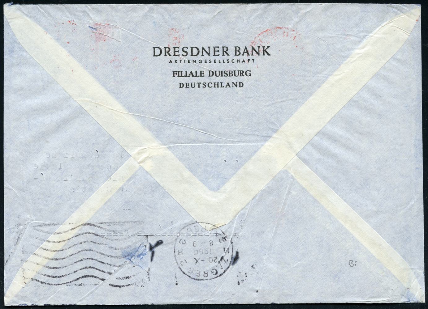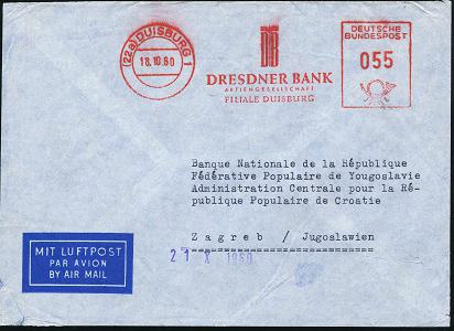 6921 | 18 € | 4100 Duisburg Absender-Freistempel : (22a) DUISBURG 1/ DB/ DRESDNER BANK/ AG.. 1960 (18.10.) AFS Francotyp 055 Pf. (Monogr.-Logo) Luftpostleichtbf., rs. Abs.-Vordruck, Ausl.-Flp.-Bf. n. Zagreb, rs. AS. (= 1. Gew.Stufe , Götz + 40.- DM, 1980) | ![]() ![]() | |