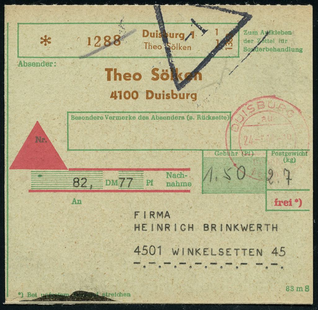 6924 | 16 € | 4100 Duisburg Absender-Freistempel : DUISBURG 1/ au/ Gebühr/ bezahlt 1964 (24.1.) roter 1K-Segm.-Paketfreistempel (Handstpl. o. PLZ) auf grüner Inl.-Selbstbucher-NN-Postgut-Paketkt.: 4100 Duisburg/Theo Sölken (Dürst-Eich unbekannte Type) | ![]() | |