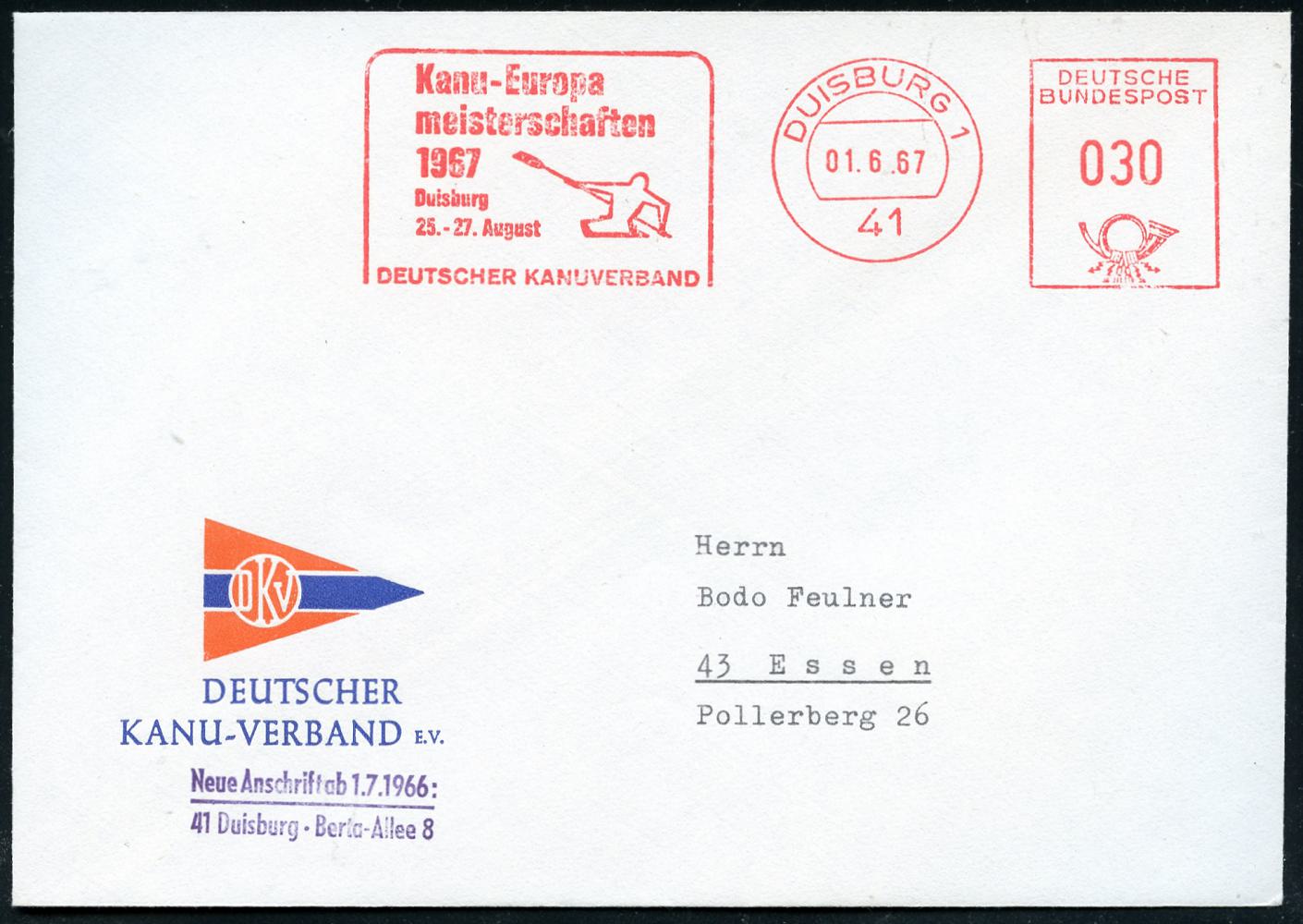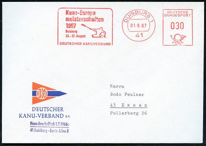 6926 | 15 € | 4100 Duisburg Absender-Freistempel : 41 DUISBURG 1/ Kanu-Europa/ meisterschaften/ ..DEUTSCGER KANUVERBAND 1967 (1.6.) AFS Francotyp (Kajak-Einer) dekorativer, zweifarbiger Vordruck-Bf.: DEUTSCHER KANU-VERBAND (Wimpel) vergl. Kat.-Nr.6927 (Dü.E-26, nur einige Monate verwendet) | ![]() | |