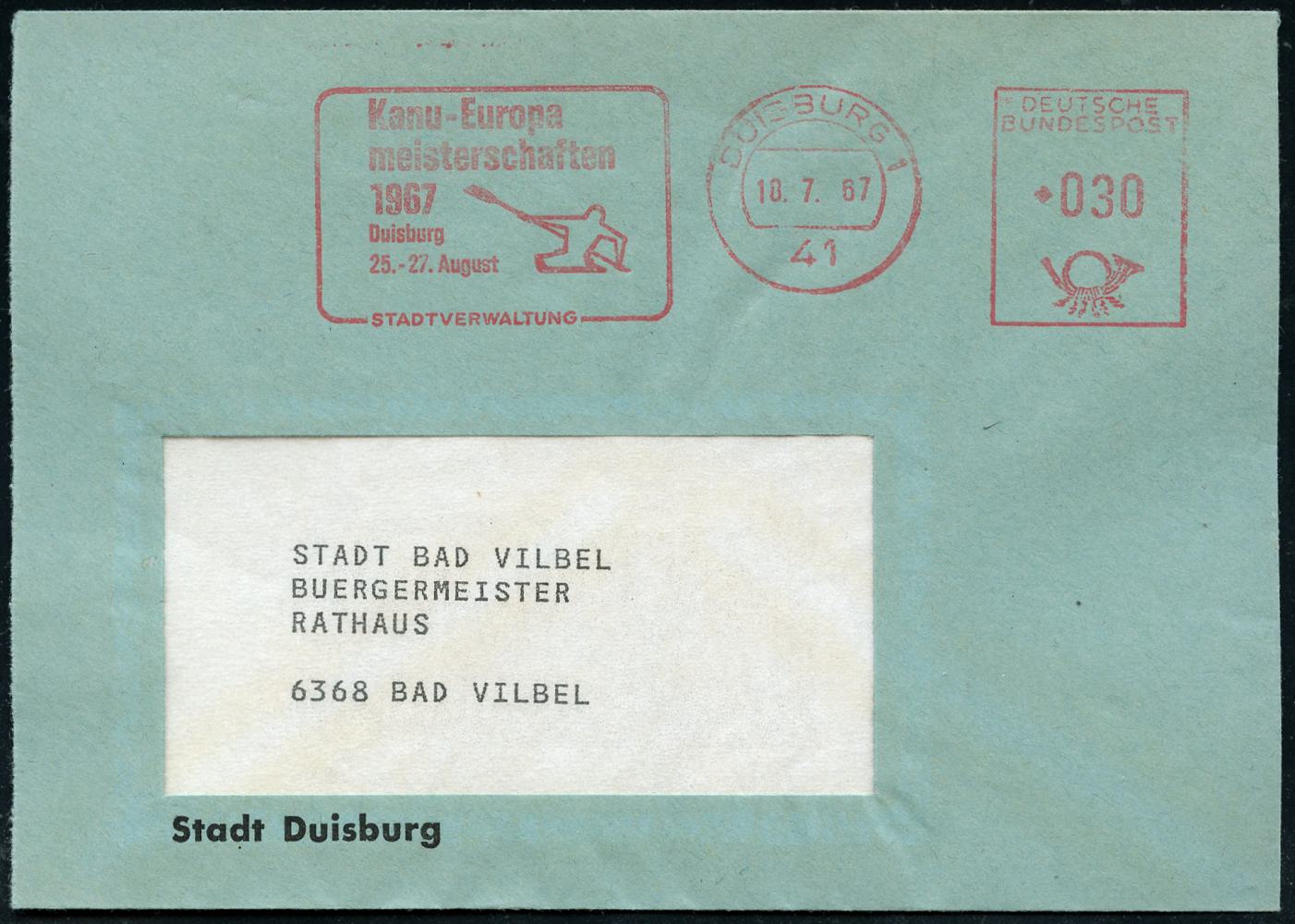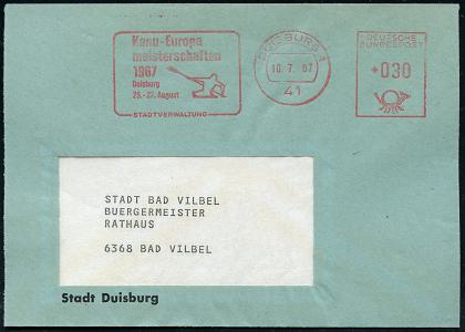 6927 | 12 € | 4100 Duisburg Absender-Freistempel : 41 DUISBURG 1/ Kanu-Europa/ meisterschaften/ ..25.-27.August/ STADTVERWALTUNG 1967 (18.7.) AFS Francotyp (Kajak-Einer) klar auf Kommunal-Bf.: Stadt Duisburg, vergl. Kat.-Nr.6926 (Dü.E-26, nur einige Monate verwendet) | ![]() | |