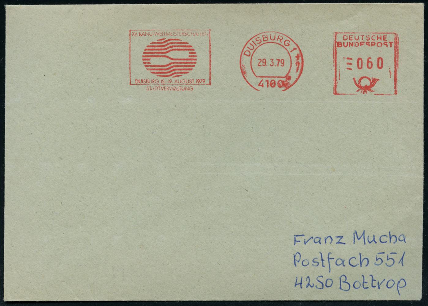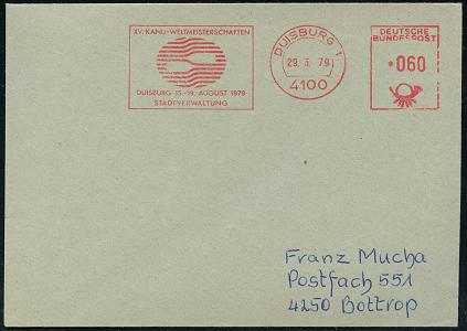 6929 | 14 € | 4100 Duisburg Absender-Freistempel : 4100 DUISBURG 1/ XV.KANU-WELTMEISTERSCHAFTEN/ STADTVERWALTUNG 1979 (29.3.) AFS Francotyp (2 Ruder = Logo) klar gest. Inl.-Bf., vergl. Kat.-Nr.6930 (Dü.E-26, nur kurze Verwendungszeit) | ![]() | |